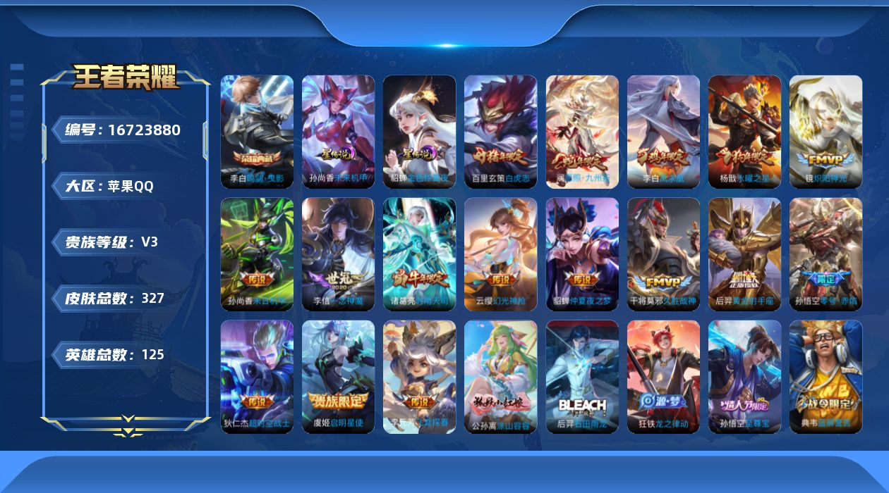 [16723880]苹果Q-V3-尊贵铂金IV段位-125英雄-327皮肤-1典藏皮肤-17传说-98史诗 【英雄全皮】:猪八戒全皮 【荣耀典藏】:李白鸣剑曳影 【传说皮肤】:后羿神树通天,澜愿照九州拓,云缨幻光神枪,李元芳飞鸢探春,诸葛亮时雨天司,镜炽阳神光,虞姬启明星使,孙悟空零号赤焰,李信一念神魔,干将莫邪久胜战神,百里玄策白虎志,后羿黄金射手座,杨戬永曜之星,貂蝉仲夏夜之梦,李白凤求凰,孙尚香末日机甲,狄仁杰超时空战士 【限定皮肤】:白起狰,狄仁杰阴阳师,虞姬凯尔特女王,赵云皇家上将,墨子神迹守卫,妲己时之彼端,嬴政优雅恋人,嬴政白昼王子,鲁班七号狮舞东方,庄周高山流水,高渐离死亡摇滚,高渐离玩趣恶龙,阿轲迷踪丽影,扁鹊炼金王,芈月重明,芈月白晶晶,芈月幻夜卜梦,吕布猎兽之王,周瑜赤莲之焰,元歌云间偶戏,元歌无心,夏侯惇朔风刀,曹操烛龙,典韦穷奇,典韦蓝屏警告,马可波罗逐梦之星,马可波罗暗影游猎,狄仁杰魔术师,狄仁杰万华元夜,达摩星际陆战队,达摩沙漠行僧,项羽海滩派对,老夫子醍醐杖,老夫子航海奇遇记,关羽冰锋战神,程咬金演武夺筹,刘邦夺宝奇兵,韩信飞衡,王昭君午后时光,兰陵王驯魔猎人,兰陵王金庭之子,花木兰青春决赛季,花木兰默契交锋,亚瑟潮玩骑士王,孙悟空至尊宝,孙悟空零号赤焰,牛魔御旌,后羿如梦令,后羿圣弓游侠,李元芳银河之约,李元芳云中旅人,虞姬霸王别姬,虞姬启明星使,钟馗神迹守卫,钟馗驱傩正仪,杨玉环遇见飞天,杨戬永曜之星,女娲朔望之晖,干将莫邪真爱魔法,雅典娜单词大作战,雅典娜黎明之约,蔡文姬繁星吟游,太乙真人饕餮,太乙真人华丽摇滚,鬼谷子原初探秘者,鬼谷子五谷丰年,诸葛亮时雨天司,黄忠火炮绅士,铠青龙志,苏烈千军破阵,百里玄策白虎志,百里玄策原初追逐者,弈星混沌棋,梦奇顽趣,公孙离蜜橘之夏,沈梦溪星空之诺,沈梦溪大漠名商,明世隐疑决卦,裴擒虎李小龙,裴擒虎擒涛扼浪,狂铁御狮,狂铁电玩高手,米莱狄御霄,米莱狄胡桃异想国,云中君纤云弄巧,盾山御銮,猪八戒西部大镖客,猪八戒猪悟能,上官婉儿梁祝,上官婉儿天狼绘梦者,嫦娥拒霜思,蒙犽狂想玩偶喵,镜匿光追影者,桑启海盐诗旅,艾琳女武神,张良古海寻踪,蒙犽百解令,鬼谷子天穹祈灯,伽罗琥珀纪元 【年限皮肤】:李白凤求凰,杨戬永曜之星,百里玄策白虎志,铠青龙志,韩信飞衡,诸葛亮时雨天司,澜愿照九州拓 【赛季限定】:扁鹊炼金王,虞姬凯