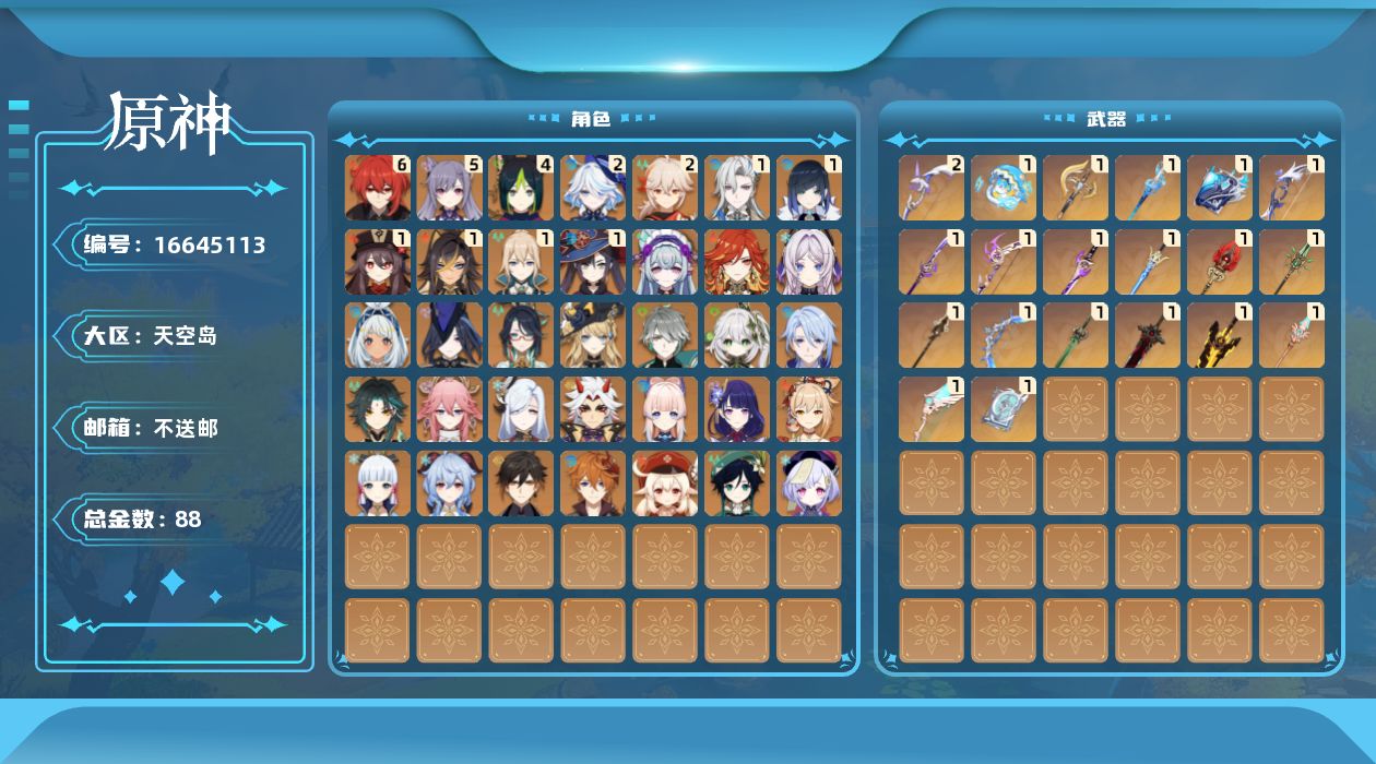 0命克洛琳德,0命闲云,0命娜维娅,2命芙宁娜,1命那维莱特,1命迪希雅,0命艾尔海森,0命纳西妲,4命提纳里,1命夜兰,0命神里绫人,0命八重神子,0命申鹤,0命荒泷一斗,0命雷电将军,2命枫原万叶,0命神里绫华,0命钟离,1命胡桃,0命甘雨,0命魈,0命宵宫,0命温迪,0命可莉,0命达达利亚,0命珊瑚宫心海,5命刻晴,0命七七,1命琴,1命莫娜,满命迪卢克,0命玛拉妮,0命玛薇卡,0命茜特菈莉,0命梦见月瑞希,0命菈乌玛,0命菲林斯,精1裁断,精1静水流涌之辉,精1万世流涌大典,精1若水,精1冬极白星,精1薙草之稻光,精1飞雷之弦振,精1雾切之回光,精1苍古自由之誓,精1无工之剑,精1护摩之杖,精1磐岩结绿,精1四风原典,精1和璞鸢,精1天空之脊,精1贯虹之槊,精1天空之翼,精2阿莫斯之弓,精1狼的末路,精1冲浪时光