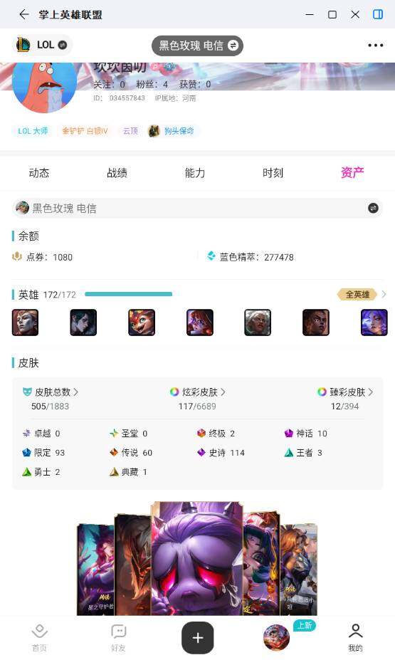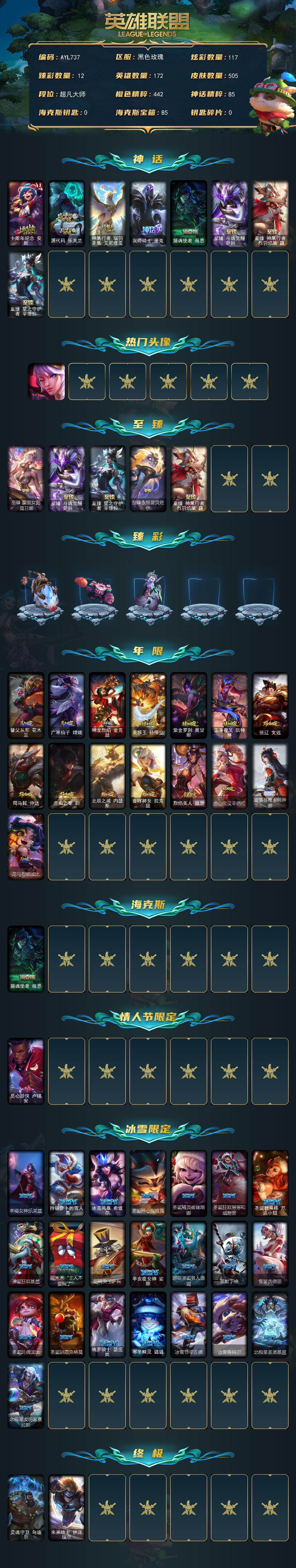 [16712696]大师段位-172英雄-505皮肤-117炫彩-2终极-10神话-93限定-60传说-114史诗