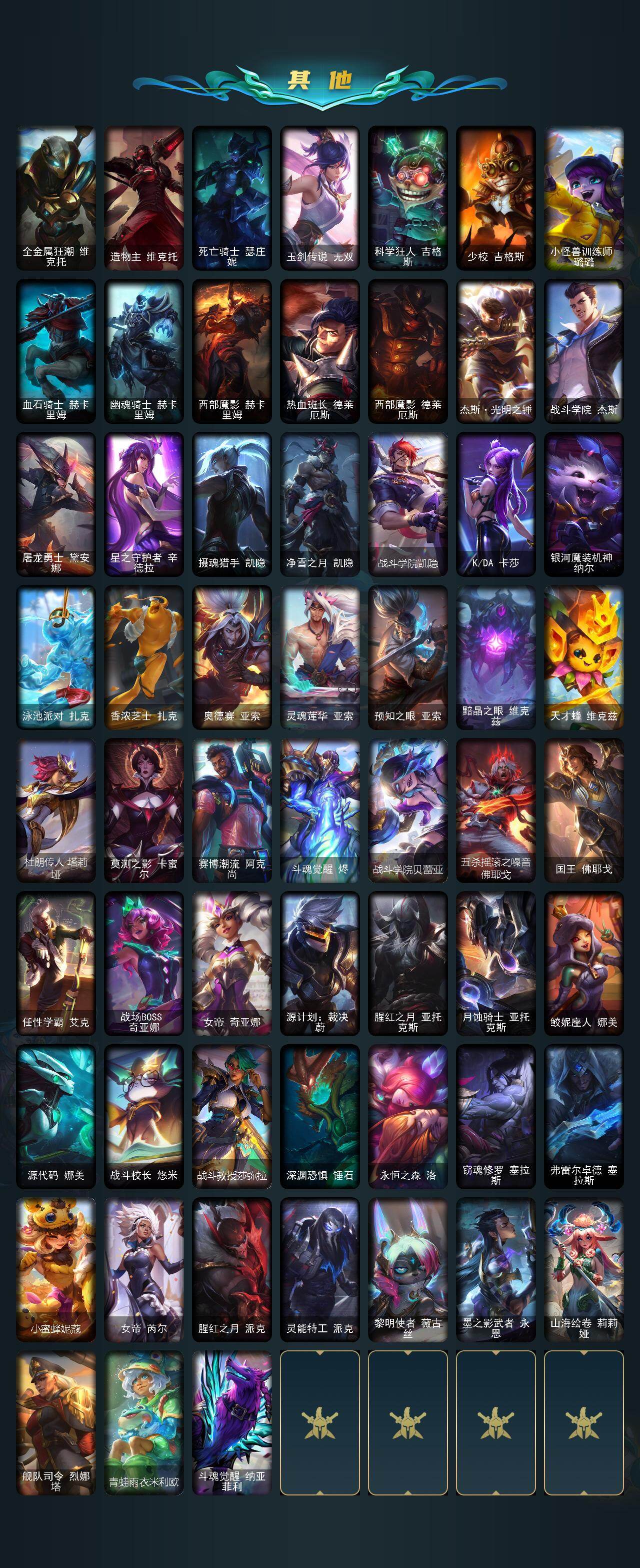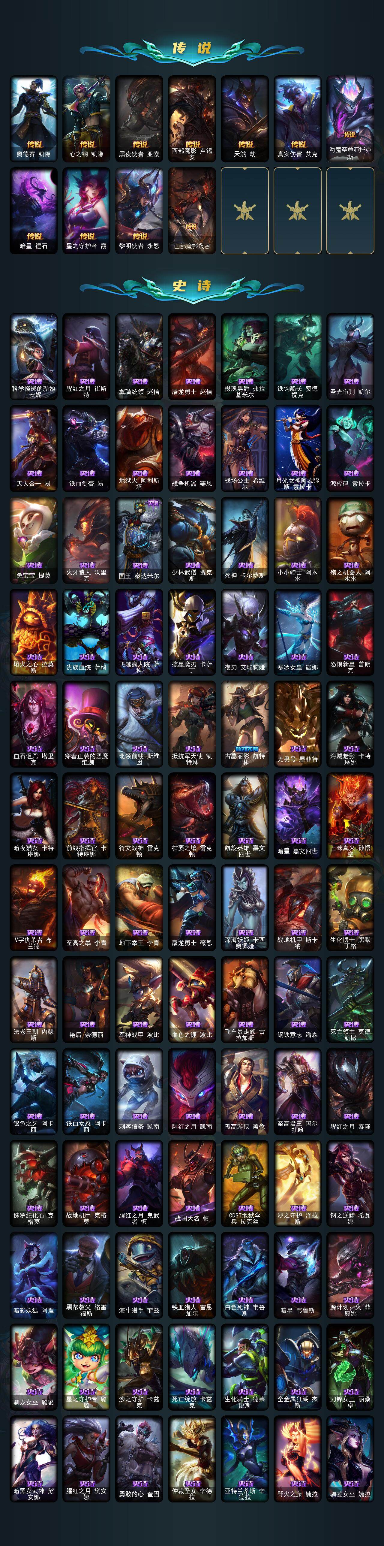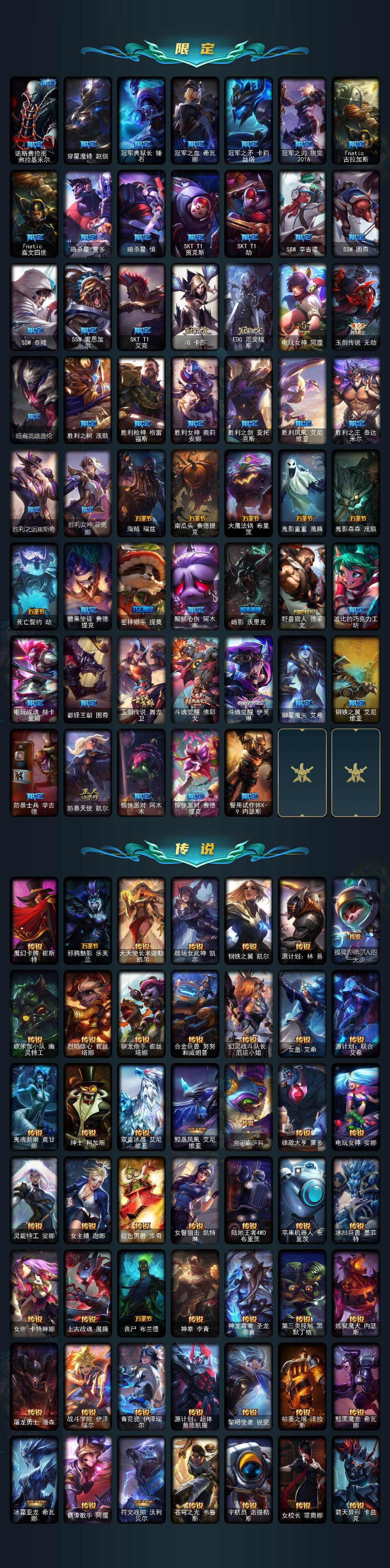 【年限皮肤】:替父从军花木兰,广寒仙子嫦娥,神龙烈焰金克丝,美猴王孙悟空,紫金罗刹莫甘娜,玉净夜叉凯特琳,张辽文远,司马懿仲达,虎痴之拳蔚,北辰之威内瑟斯,春晖神女拉克丝,烈焰美人薇恩,点心宝贝辛德拉,踏雪寻梅卡特琳娜,龙马烈焰波比