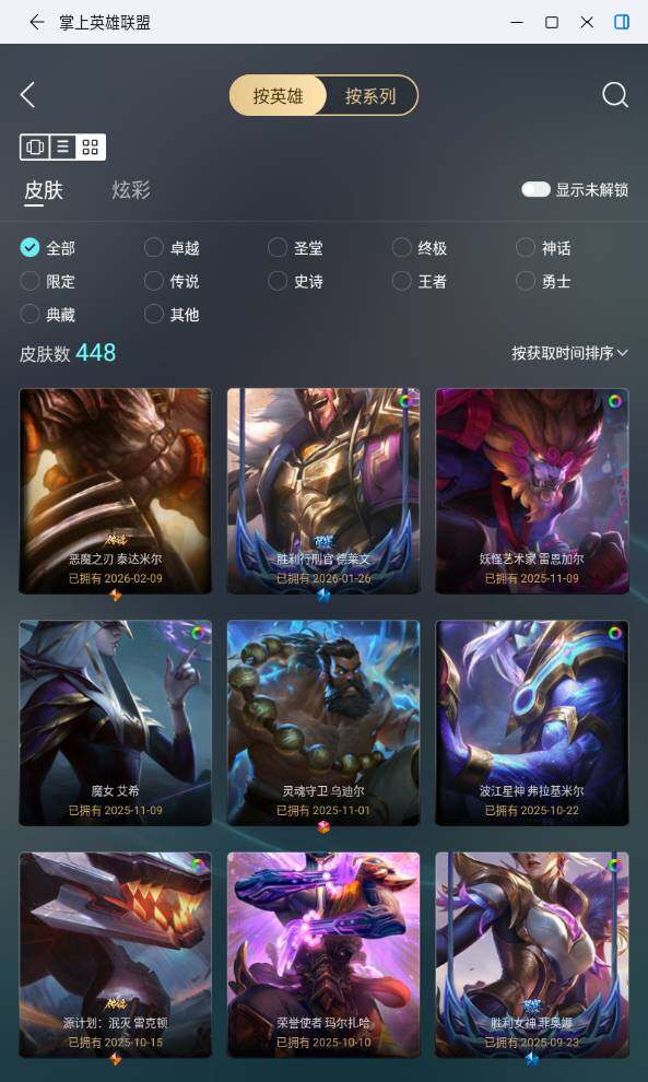 [16712618]未定级段位-172英雄-448皮肤-68炫彩-4终极-6神话-77限定-42传说-114史诗