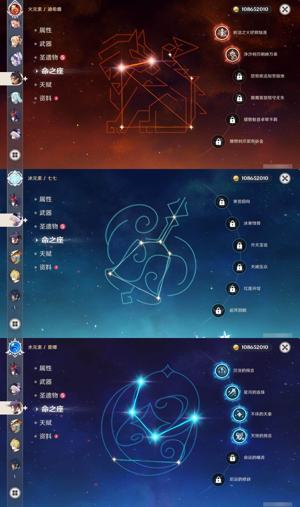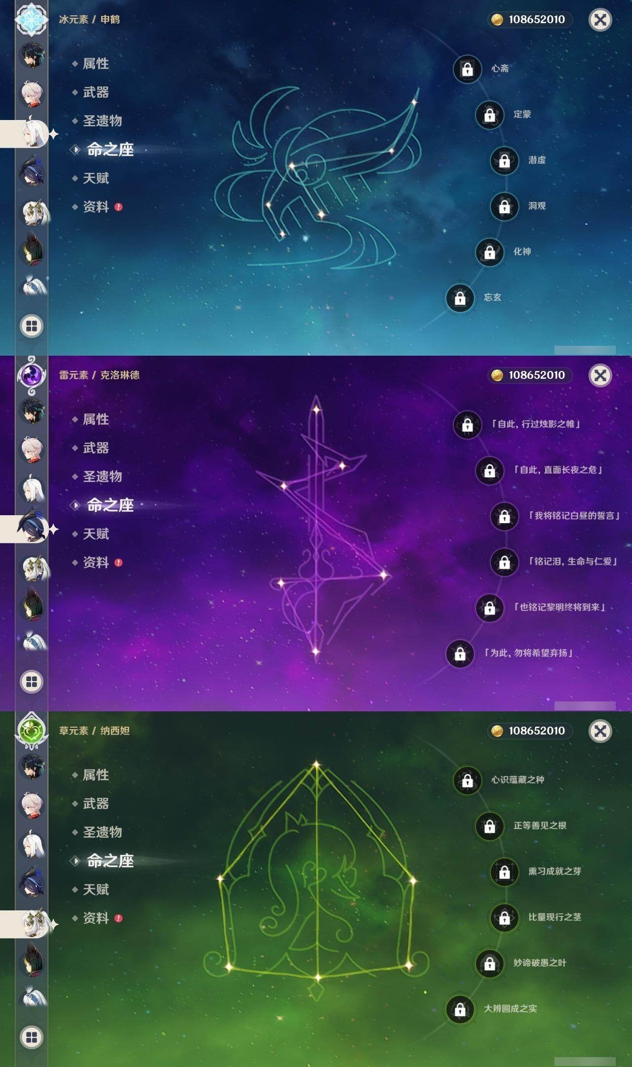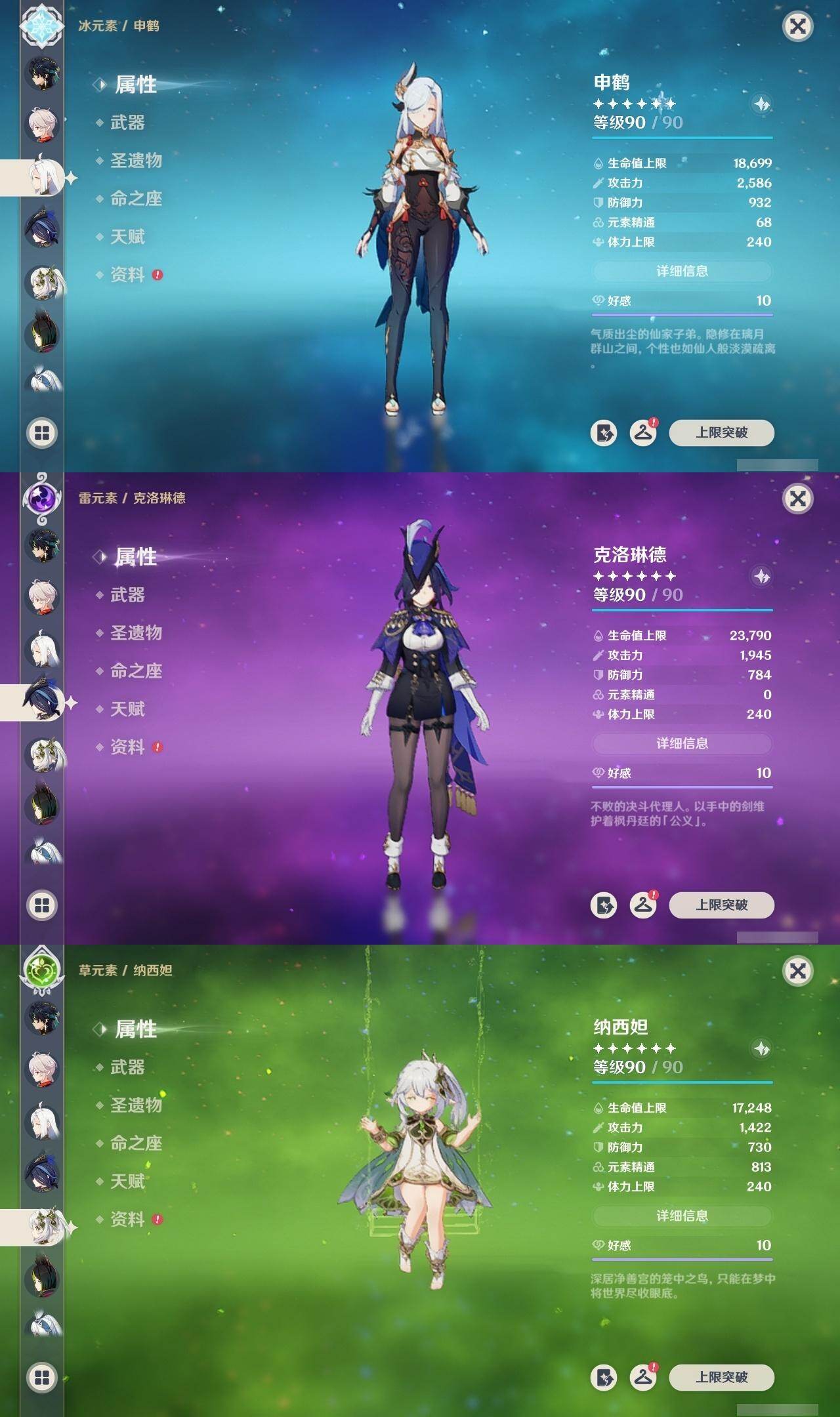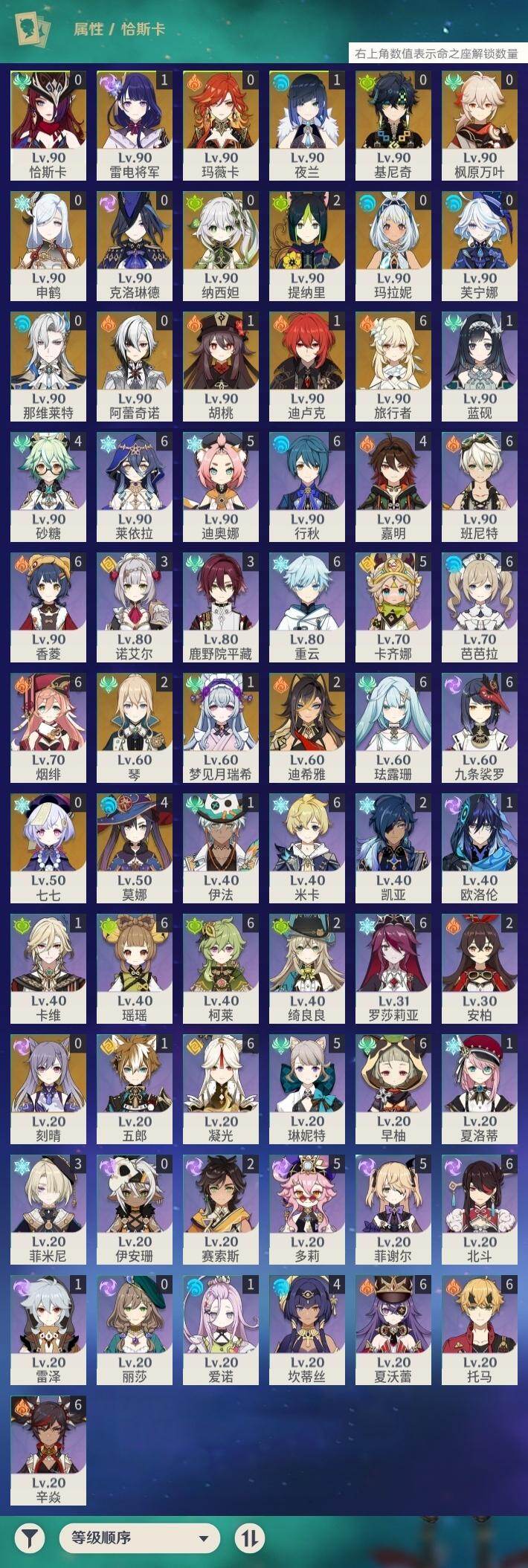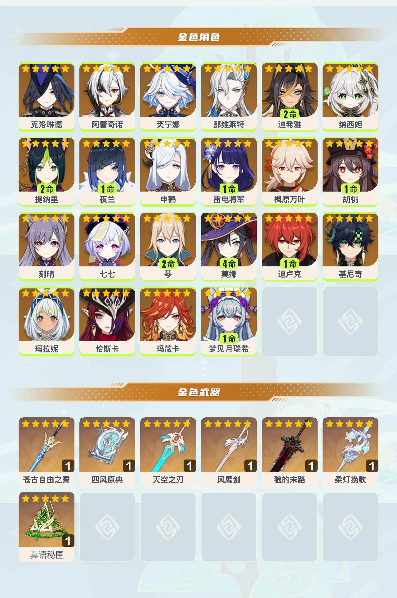 0命克洛琳德,0命阿蕾奇诺,0命芙宁娜,0命那维莱特,2命迪希雅,0命纳西妲,2命提纳里,1命夜兰,0命申鹤,1命雷电将军,0命枫原万叶,1命胡桃,0命刻晴,0命七七,2命琴,4命莫娜,1命迪卢克,0命基尼奇,0命玛拉妮,0命恰斯卡,0命玛薇卡,1命梦见月瑞希,精1苍古自由之誓,精1四风原典,精1天空之刃,精1风鹰剑,精1狼的末路,精1柔灯挽歌,精1真语秘匣