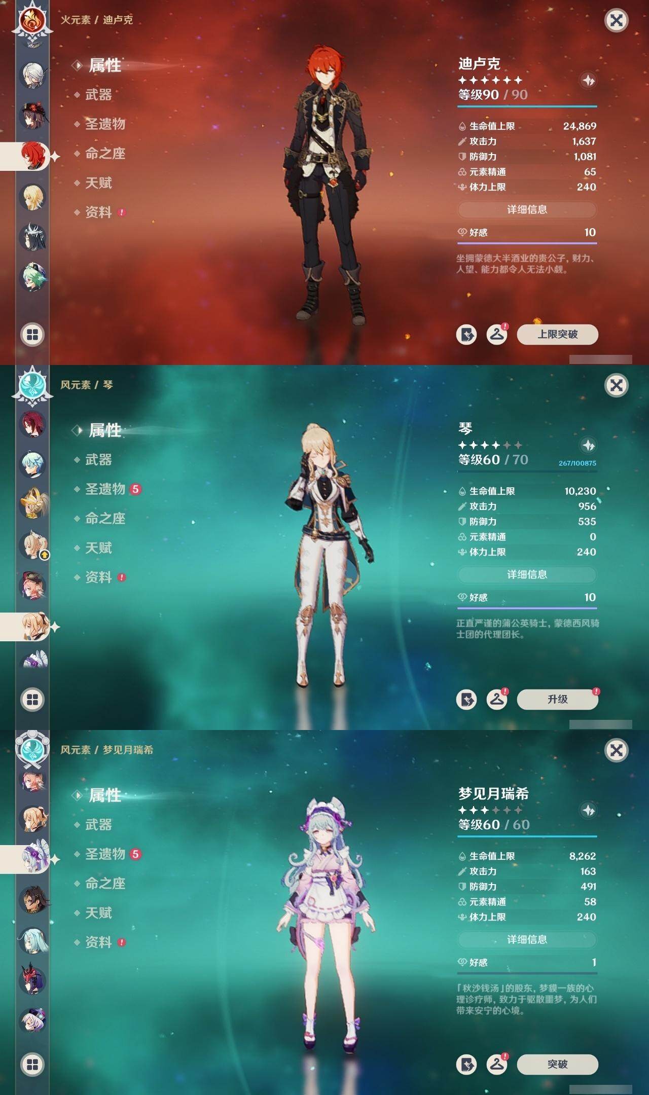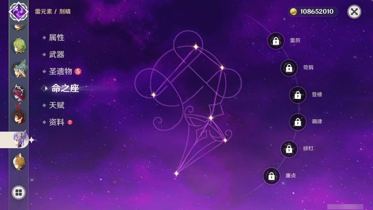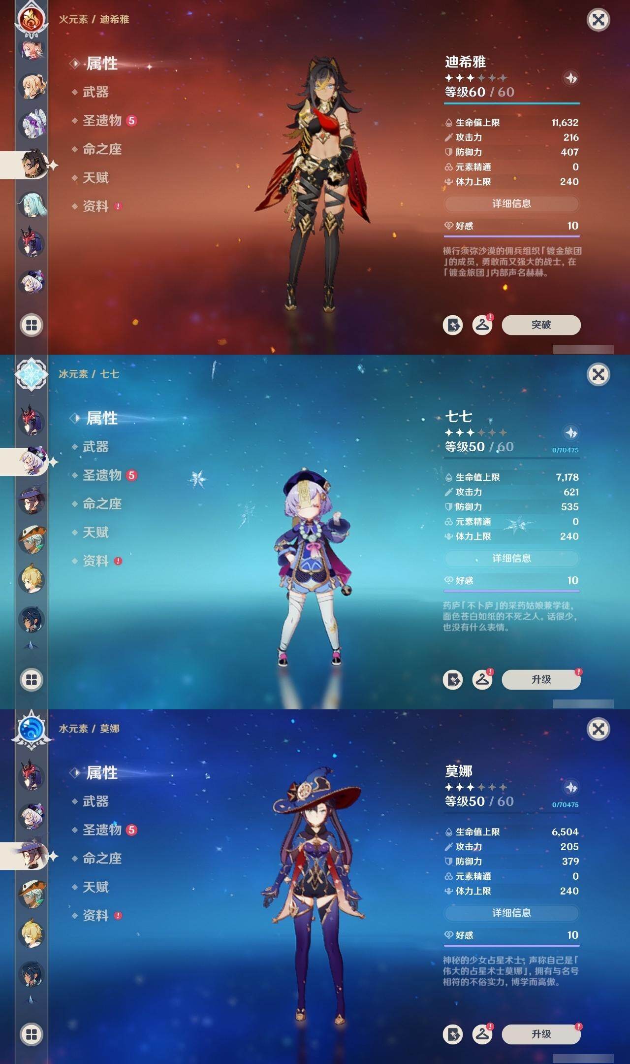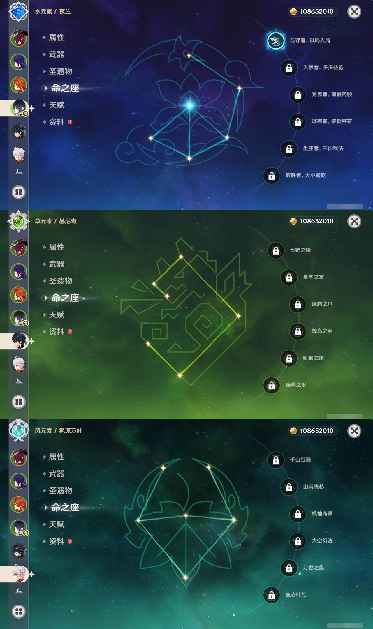 0命克洛琳德,0命阿蕾奇诺,0命芙宁娜,0命那维莱特,2命迪希雅,0命纳西妲,2命提纳里,1命夜兰,0命申鹤,1命雷电将军,0命枫原万叶,1命胡桃,0命刻晴,0命七七,2命琴,4命莫娜,1命迪卢克,0命基尼奇,0命玛拉妮,0命恰斯卡,0命玛薇卡,1命梦见月瑞希,精1苍古自由之誓,精1四风原典,精1天空之刃,精1风鹰剑,精1狼的末路,精1柔灯挽歌,精1真语秘匣