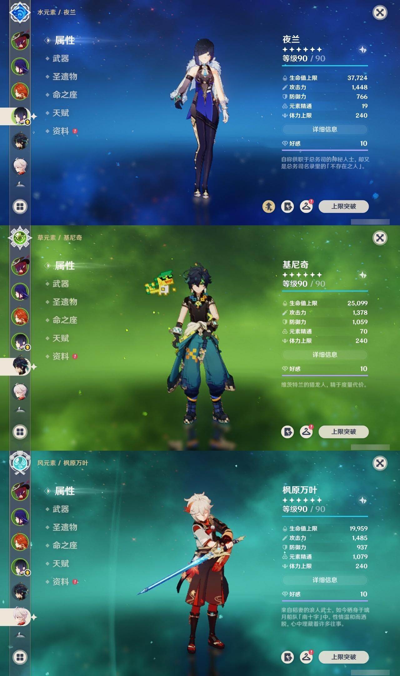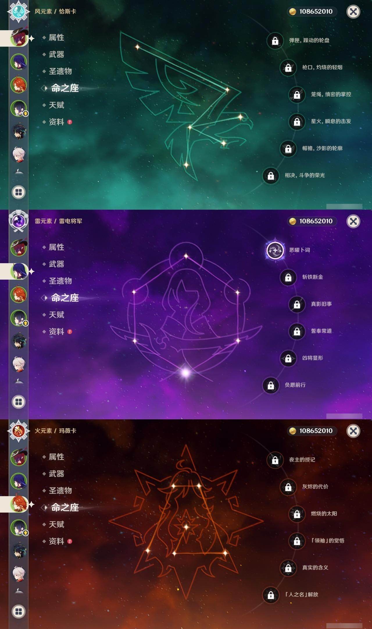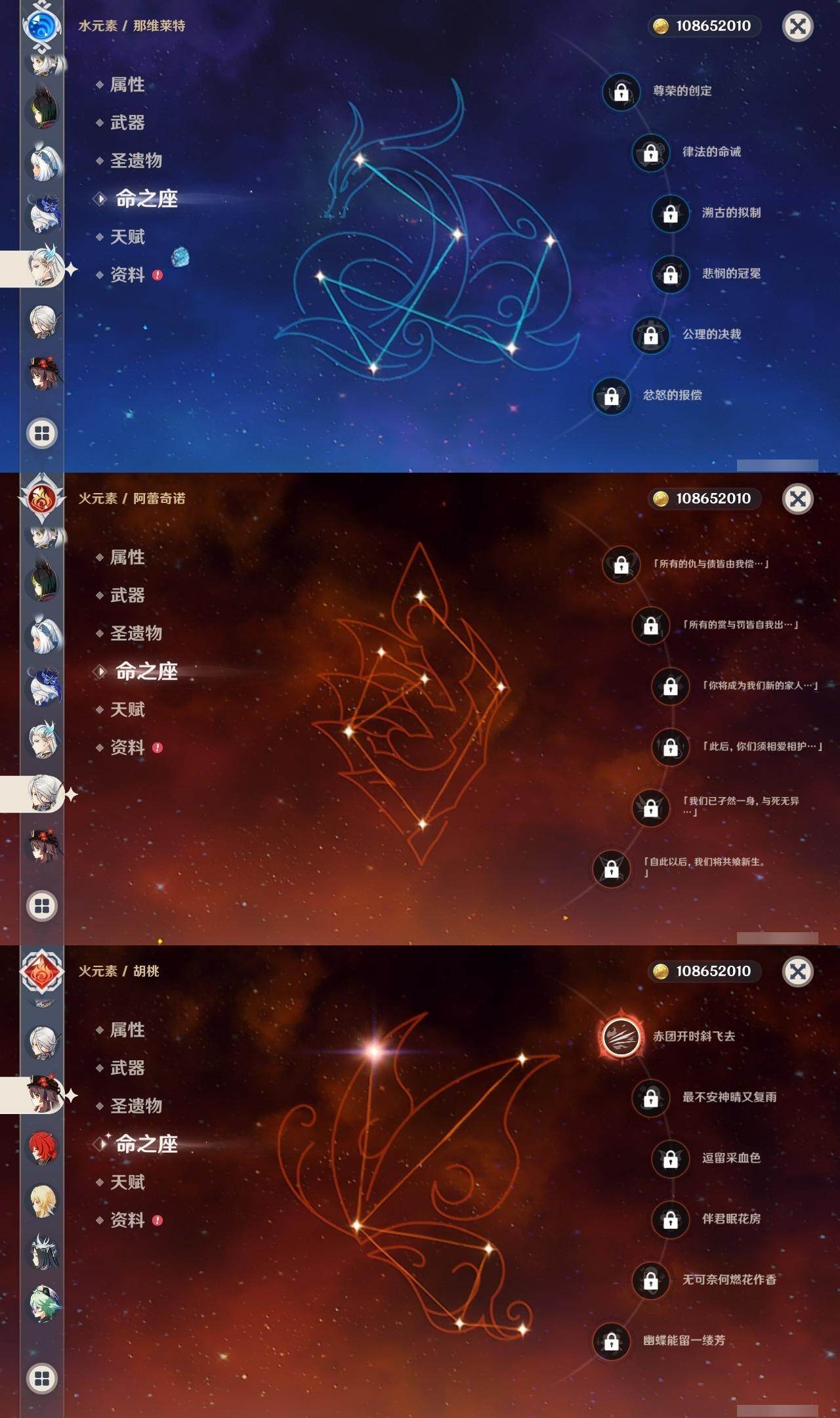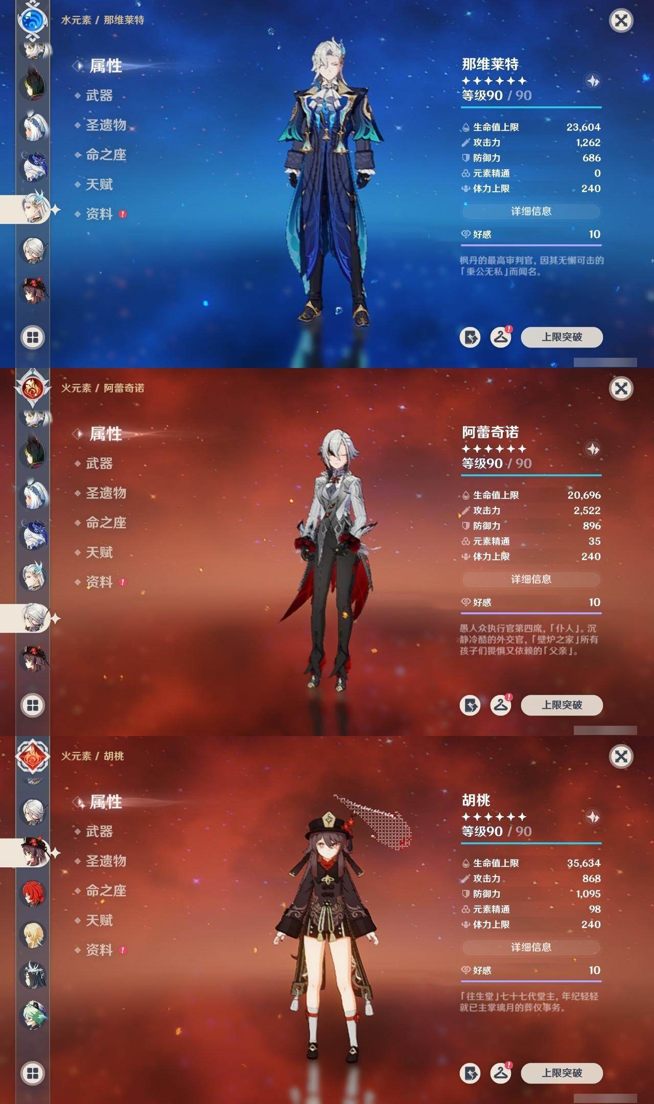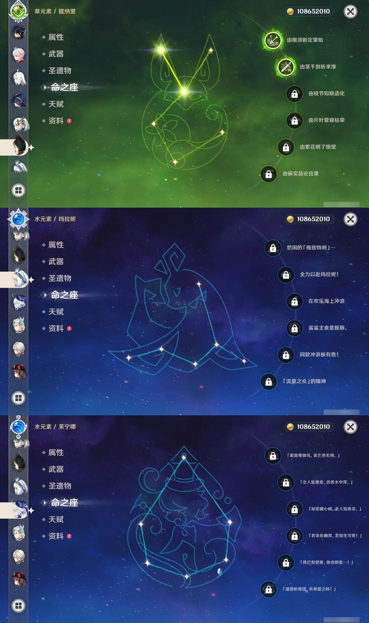 0命克洛琳德,0命阿蕾奇诺,0命芙宁娜,0命那维莱特,2命迪希雅,0命纳西妲,2命提纳里,1命夜兰,0命申鹤,1命雷电将军,0命枫原万叶,1命胡桃,0命刻晴,0命七七,2命琴,4命莫娜,1命迪卢克,0命基尼奇,0命玛拉妮,0命恰斯卡,0命玛薇卡,1命梦见月瑞希,精1苍古自由之誓,精1四风原典,精1天空之刃,精1风鹰剑,精1狼的末路,精1柔灯挽歌,精1真语秘匣
