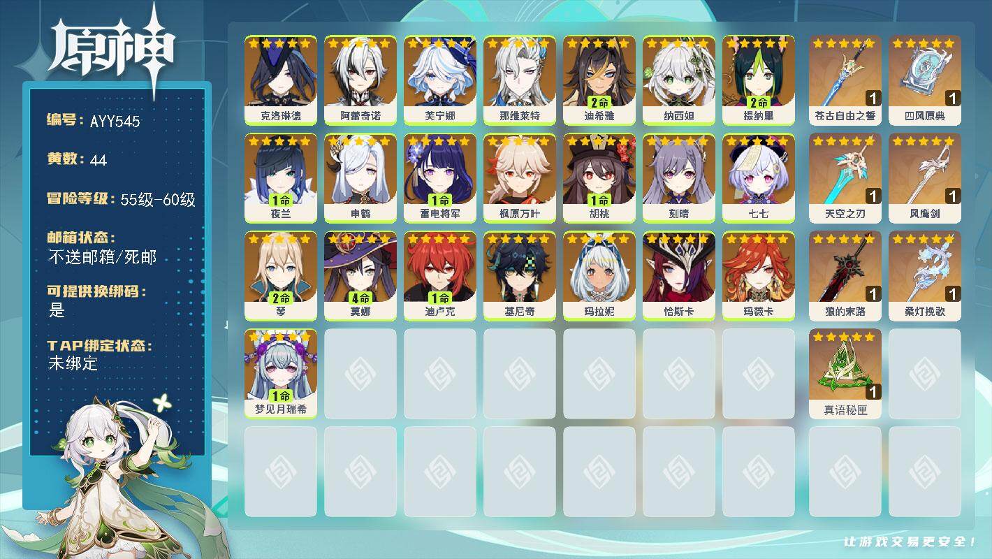 [16713784]【店主推荐捡漏号】60级/44黄/女主/22个五星角色/7个五星武器 0命克洛琳德,0命阿蕾奇诺,0命芙宁娜,0命那维莱特,2命迪希雅,0命纳西妲,2命提纳里,1命夜兰,0命申鹤,1命雷电将军,0命枫原万叶,1命胡桃,0命刻晴,0命七七,2命琴,4命莫娜,1命迪卢克,0命基尼奇,0命玛拉妮,0命恰斯卡,0命玛薇卡,1命梦见月瑞希,精1苍古自由之誓,精1四风原典,精1天空之刃,精1风鹰剑,精1狼的末路,精1柔灯挽歌,精1真语秘匣