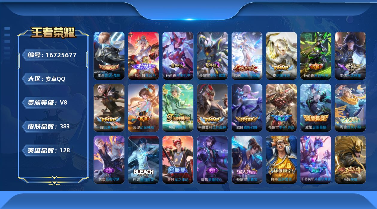 [16725677]安卓Q-V8-383皮肤-1典藏皮肤-1无双-11传说-124史诗 【英雄全皮】:钟馗全皮,太乙真人全皮,猪八戒全皮,戈娅全皮,空空儿全皮,影全皮 【荣耀典藏】:李白鸣剑曳影 【无双皮肤】:不知火舞花合斗 【传说皮肤】:女娲愿照千秋盛,云缨幻光神枪,桑启鸣野蒿,镜炽阳神光,虞姬启明星使,孙悟空零号赤焰,曜云鹰飞将,李信一念神魔,貂蝉猫影幻舞,干将莫邪久胜战神,孙尚香末日机甲 【限定皮肤】:白起狰,蔡文姬夏日便利店,大乔绒语心约,虞姬夏日便利店,姜子牙天穹之誓,李白谪仙醉月,狄仁杰阴阳师,赵云皇家上将,墨子神迹守卫,嬴政优雅恋人,嬴政白昼王子,鲁班七号狮舞东方,庄周高山流水,高渐离死亡摇滚,高渐离玩趣恶龙,钟无艳超时空战士,孙膑天狼运算者,扁鹊奇幻香踪,芈月重明,芈月白晶晶,芈月幻夜卜梦,吕布猎兽之王,吕布御风骁将,元歌云间偶戏,元歌无心,夏侯惇朔风刀,甄姬落雪兰心,曹操烛龙,典韦穷奇,典韦蓝屏警告,马可波罗暗影游猎,马可波罗山海玄木吟,狄仁杰魔术师,狄仁杰万华元夜,达摩星际陆战队,达摩沙漠行僧,项羽海滩派对,老夫子醍醐杖,老夫子航海奇遇记,关羽冰锋战神,貂蝉逐梦之音,程咬金演武夺筹,露娜一生所爱,韩信飞衡,兰陵王金庭之子,花木兰青春决赛季,花木兰瑞麟志,花木兰默契交锋,亚瑟潮玩骑士王,孙悟空至尊宝,孙悟空大圣娶亲,孙悟空零号赤焰,孙悟空孙行者,牛魔御旌,牛魔奔雷神使,后羿辉光之辰,后羿圣弓游侠,张飞虎魄,李元芳银河之约,李元芳云中旅人,虞姬启明星使,钟馗神迹守卫,钟馗驱傩正仪,杨玉环遇见飞天,杨戬潮玩骑兵,女娲朔望之晖,干将莫邪冰霜恋舞曲,干将莫邪真爱魔法,雅典娜单词大作战,雅典娜黎明之约,太乙真人饕餮,太乙真人华丽摇滚,东皇太一逐梦之光,鬼谷子原初探秘者,鬼谷子五谷丰年,黄忠火炮绅士,苏烈千军破阵,百里玄策原初追逐者,弈星混沌棋,梦奇顽趣,梦奇天降福星,沈梦溪星空之诺,沈梦溪大漠名商,明世隐疑决卦,裴擒虎天狼狩猎者,裴擒虎李小龙,裴擒虎擒涛扼浪,狂铁御狮,米莱狄御霄,云中君纤云弄巧,伽罗天狼溯光者,盾山御銮,猪八戒西部大镖客,猪八戒猪悟能,上官婉儿天狼绘梦者,嫦娥拒霜思,嫦娥暖冬兔眠,西施玲珑珍味,蒙犽狂想玩偶喵,鲁班大师探海日志,镜匿光追影者,桑启海盐诗旅,暃星界游侠,戈娅驭风魔法,艾琳女武神,张良古海寻踪,蒙恬荣光圣徽,鬼谷子天穹祈灯,沈梦溪龙舞盛年,刘邦剑