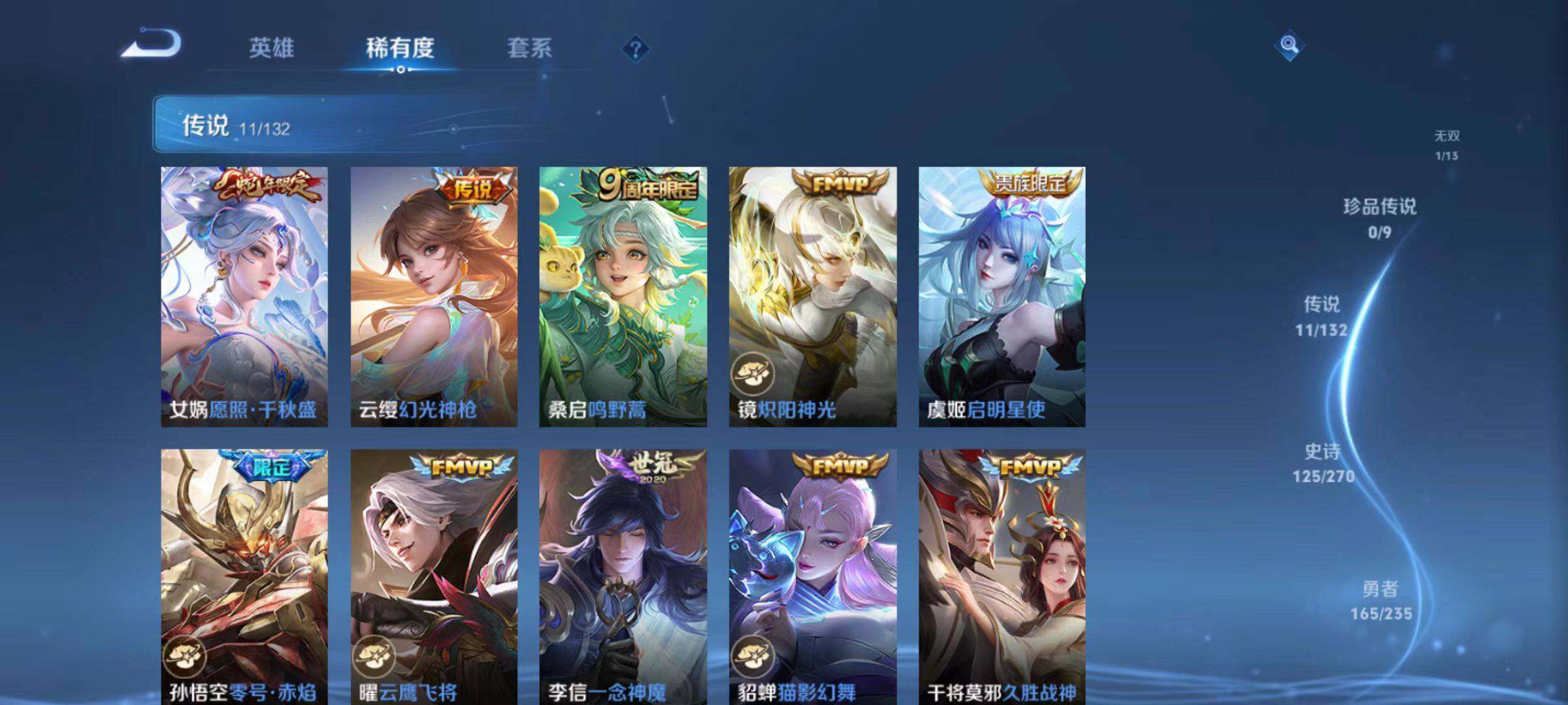 【传说皮肤】:女娲愿照千秋盛,云缨幻光神枪,桑启鸣野蒿,镜炽阳神光,虞姬启明星使,孙悟空零号赤焰,曜云鹰飞将,李信一念神魔,貂蝉猫影幻舞,干将莫邪久胜战神,孙尚香末日机甲
