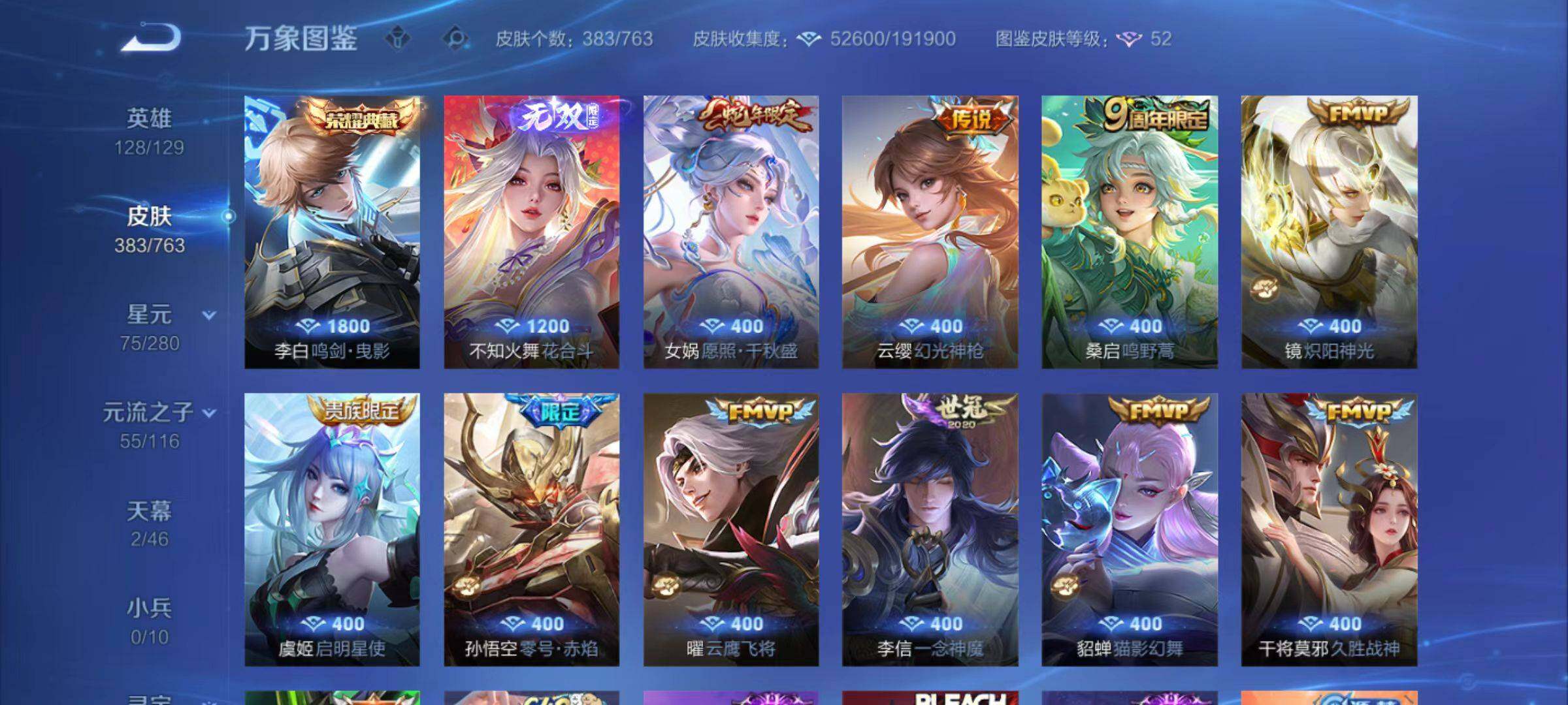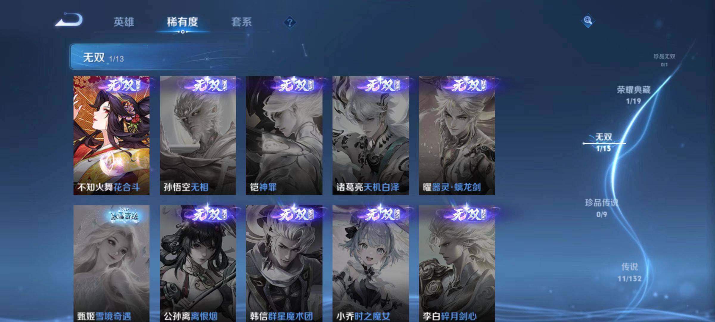 关羽冰锋战神,裴擒虎李小龙,牛魔奔雷神使,貂蝉逐梦之音,吕布御风骁将,张飞虎魄,马超神威,后羿辉光之辰,韩信飞衡,裴擒虎天狼狩猎者,孙膑天狼运算者,上官婉儿天狼绘梦者,伽罗天狼溯光者,东皇太一逐梦之光,花木兰瑞麟志,孙悟空大圣娶亲,露娜一生所爱,花木兰默契交锋,孙悟空至尊宝,干将莫邪冰霜恋舞曲,花木兰青春决赛季,芈月白晶晶,猪八戒猪悟能,孙悟空孙行者,镜匿光追影者,马可波罗山海·玄木吟,桑启鸣野蒿,女娲愿照·千秋盛