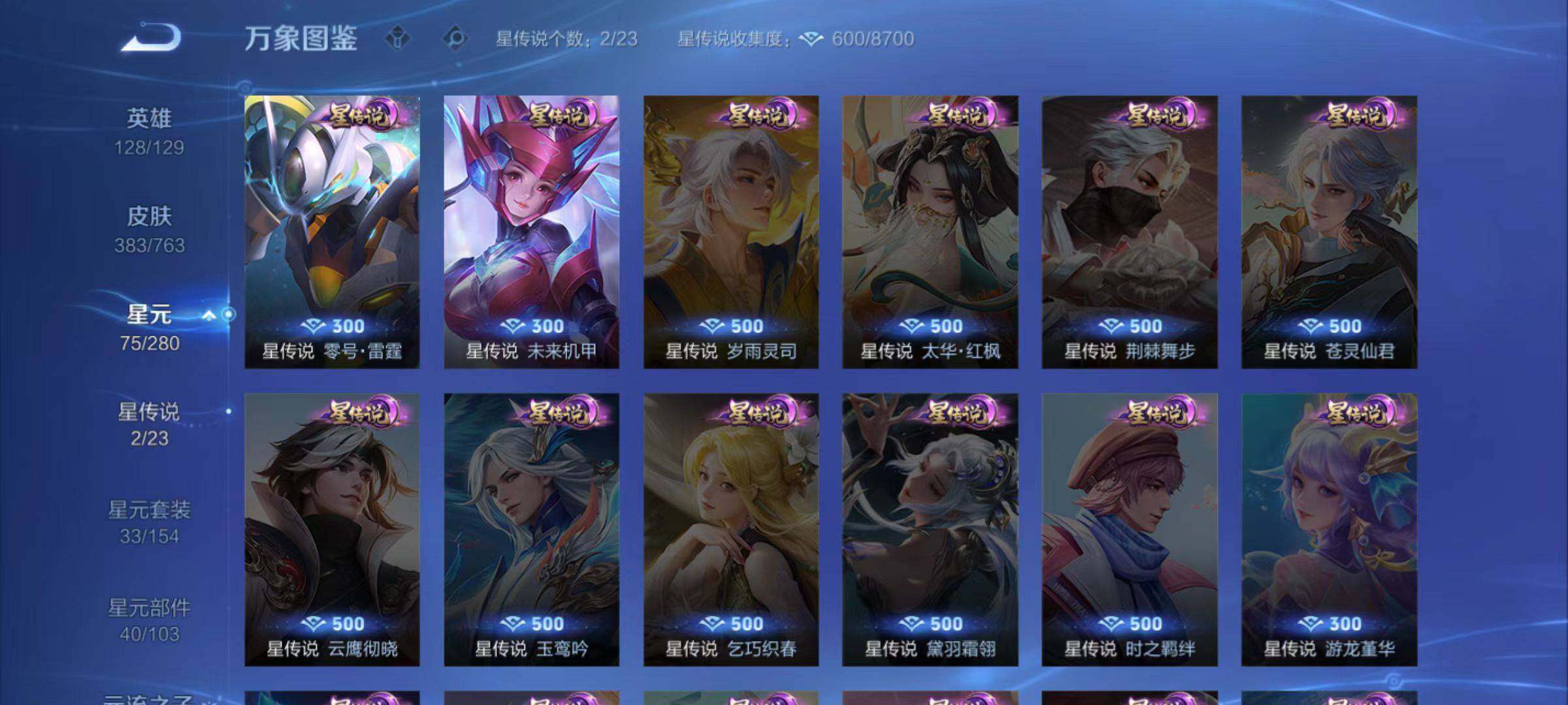 白起狰,太乙真人饕餮,曹操烛龙,芈月重明,典韦穷奇,狂铁御狮,米莱狄御霄,牛魔御旌,盾山御銮,夏侯惇朔风刀,明世隐疑决卦,老夫子醍醐杖,鬼谷子原初探秘者,狄仁杰万华元夜,程咬金演武夺筹,钟馗驱傩正仪,苏烈千军破阵,吕布猎兽之王,嬴政白昼王子,女娲朔望之晖,典韦蓝屏警告,钟馗神迹守卫,鲁班七号狮舞东方,沈梦溪星空之诺,李元芳银河之约,马可波罗暗影游猎,蒙犽狂想玩偶喵,元歌云间偶戏,弈星混沌棋,达摩沙漠行僧,兰陵王金庭之子,沈梦溪大漠名商,李元芳云中旅人,桑启海盐诗旅,裴擒虎擒涛扼浪,鲁班大师探海日志,张良古海寻踪,项羽苍威无极,镜青焰无极