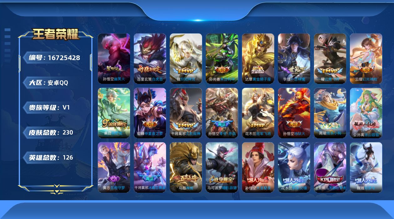 - [11823806]V10 3典藏 1无双 1珍品传说 81传说 125英雄 553皮肤 可修改实名 优质装备:无限飓风号(高达),鸣剑·曳影,弑枪猎影(韩信典藏),青丘·九尾(妲己无双),大耳狗之梦,黄金狮子座,黄金射手座,冠军飞将,云鹰飞将(小将军),绛天战甲(鸡嘴战神),黄金白羊座,猫影幻舞,久胜战神,炽阳神光,一念神魔,云霓雀翎,末日机甲-孙尚香(绿蚂蚱),音你心动-小乔,零号·赤焰,地狱之眼,飞鸢探春,音你心动-周瑜,胖达荣荣,李逍遥,乞巧织情,时之恋人-刘备(电焊工),游龙清影(小青龙),淬星耀世,超时空战士-狄仁杰,遇见胡旋,花朝如约(花篮子),挚爱之约,挚爱花嫁,无双飞将,音你闪耀(rap皮),碎云,天秀幻梦,神器·狴犴令,山海·炽霜斩(李信年限),山海·琳琅生(小乔年限),山海·苍雷引(电光曜子),炽翼辉光(娃娃菜牛角包),燃星之曲,画中仙,浮生妄,记忆之芯(机甲兔),青丘·九尾,百相守梦(张飞),追逃游戏(亚瑟),追逃游戏(安琪拉),电玩·雷克斯,鹤羽星尊,灼幽烈阳,妄想实况,遇见神鼓,艾琳觅芳踪,涂山容容 传说皮:幻光神枪 珍宝阁皮:优雅恋人,女武神,玩趣恶龙 限定皮:愿照·九州拓(澜年限),愿照·山河定(司空震年限),鸣野蒿,至尊宝,白虎志(电光耗子),凤求凰(白切鸡),凤凰于飞,太华(伽罗年限),梅西,武陵仙君(小桃花),异界灵契(白毛香),傲雪梅枪,补天,寅虎·展翼(孙膑年限),前尘镜,星穹之声,绯月行,时之彼端,白鹤梁神女,白晶晶,时雨天司(水龙头),神威(电光马子),飞衡(韩信年限),玄嵩(庄周年限),山海·碧波行(瑶年限),无限倾心-项羽,瑞麟志(木兰年限),遇见飞天,高山流水,诗剑行,无限倾心-虞姬,齐天大圣,匿光决锋者,怒海麟威,降魔,五谷丰年,青龙志(铠年限),冰锋战神,幽恒(沐浴露),武圣,天狼运算者,游园惊梦,梁祝,御风骁将(吕布年限),天狼狩猎者,龙胆,逐梦之翼,逐梦之星,烈魂,岱宗(典韦年限),天狼溯光者,虎魄,逐梦之音,天狼征服者,奔雷神使(牛魔年限),祈雪灵祝(雪兔子),天狼绘梦者,李小龙,逐梦之影,逐梦之光,玄武志(苏烈年限),朱雀志(守约年限),永曜之星,辉光之辰,如梦令-嫦娥,如梦令-后羿,霸王别姬-项羽,霸王别姬-虞姬,圣诞老人,奇迹圣诞,默契交锋-兰陵王,默契交锋-花木兰,真爱至上,纯白花嫁,孙行者,猪悟能,一生所爱,