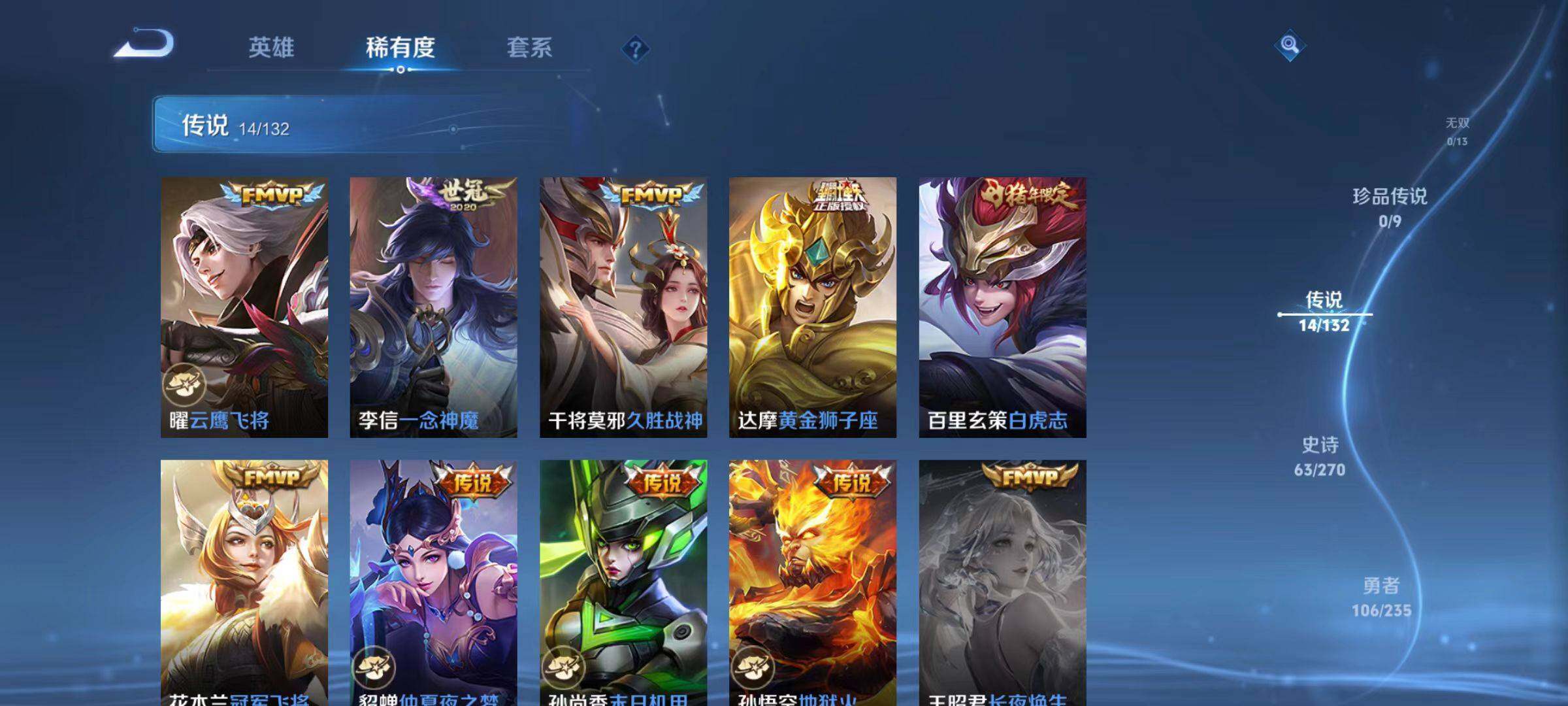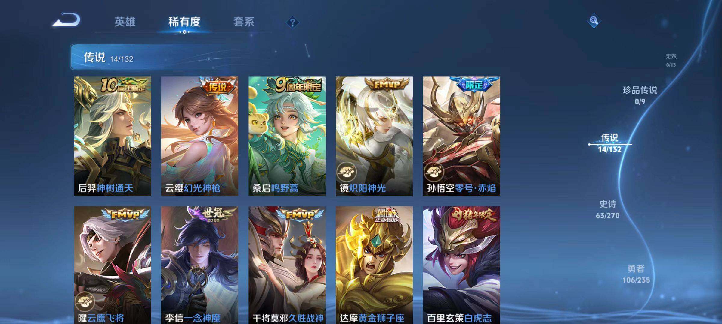 【传说皮肤】:后羿神树通天,云缨幻光神枪,桑启鸣野蒿,镜炽阳神光,孙悟空零号赤焰,曜云鹰飞将,李信一念神魔,干将莫邪久胜战神,达摩黄金狮子座,百里玄策白虎志,花木兰冠军飞将,貂蝉仲夏夜之梦,孙尚香末日机甲,孙悟空地狱火