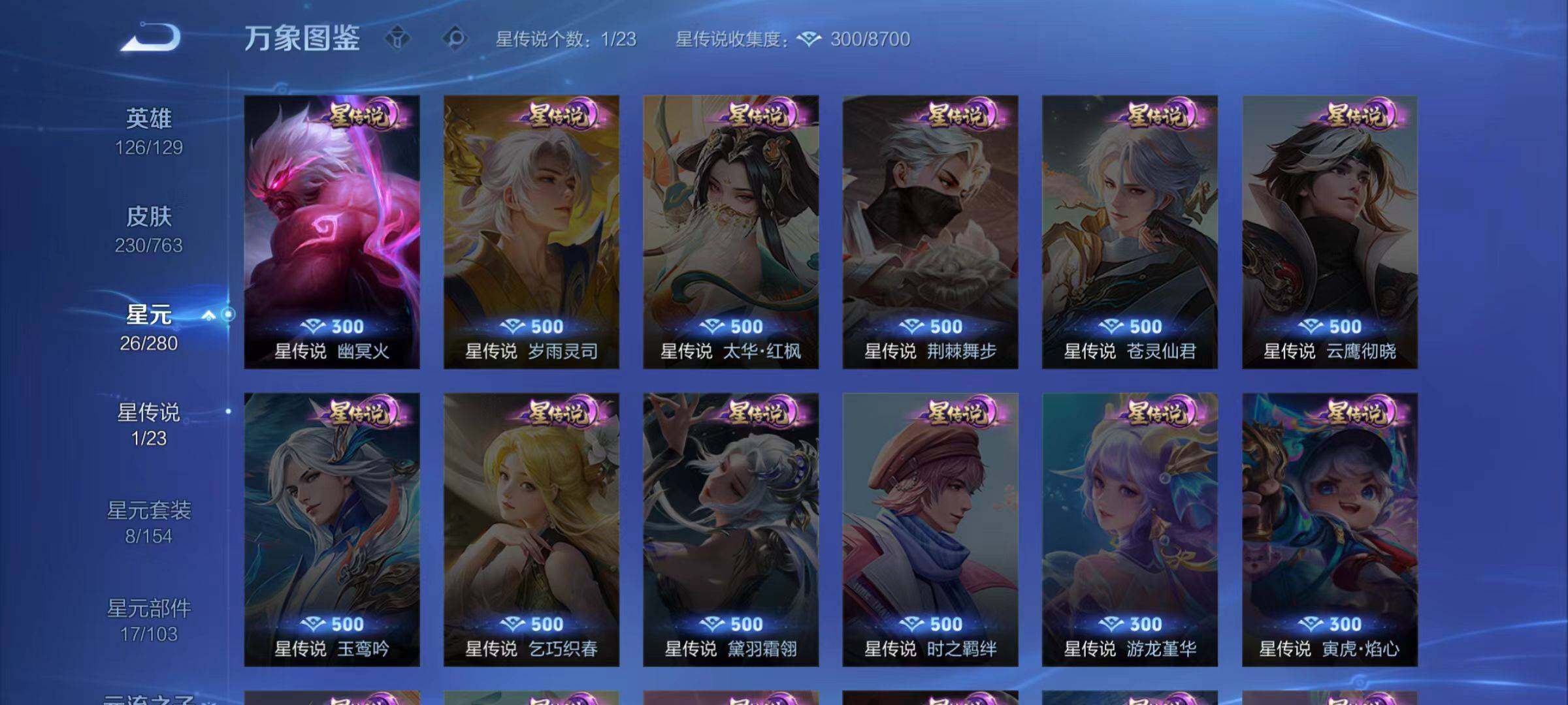 扁鹊炼金王,白起狰,太乙真人饕餮,曹操烛龙,芈月重明,典韦穷奇,狂铁御狮,米莱狄御霄,盾山御銮,夏侯惇朔风刀,明世隐疑决卦,老夫子醍醐杖,鬼谷子原初探秘者,狄仁杰万华元夜,程咬金演武夺筹,钟馗驱傩正仪,苏烈千军破阵,马可波罗暗影游猎,蒙犽狂想玩偶喵,弈星混沌棋,达摩沙漠行僧,沈梦溪大漠名商,桑启海盐诗旅,裴擒虎擒涛扼浪,鲁班大师探海日志,张良古海寻踪