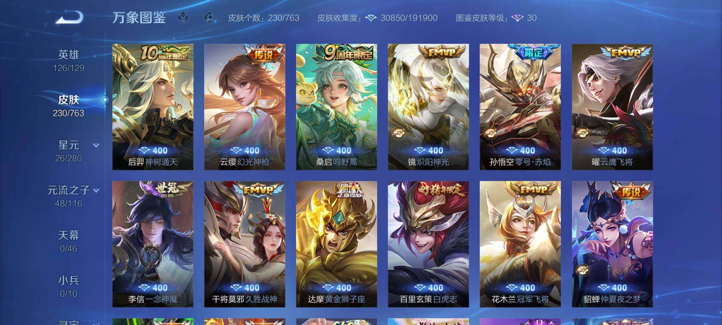 【赛季限定】:扁鹊炼金王,白起狰,太乙真人饕餮,曹操烛龙,芈月重明,典韦穷奇,狂铁御狮,米莱狄御霄,盾山御銮,夏侯惇朔风刀,弈星混沌棋,明世隐疑决卦,老夫子醍醐杖,鬼谷子原初探秘者,狄仁杰万华元夜,程咬金演武夺筹,钟馗驱傩正仪,苏烈千军破阵,达摩沙漠行僧,沈梦溪大漠名商,桑启海盐诗旅,裴擒虎擒涛扼浪,鲁班大师探海日志,张良古海寻踪,鬼谷子天穹祈灯,刘邦剑破天穹,姜子牙天穹之誓,东皇太一噬灭天穹,太乙真人谧流熔炉,亚瑟荣光之誓,百里玄策原初追逐者,雅典娜黎明之约,蒙恬荣光圣徽,牛魔星界战将