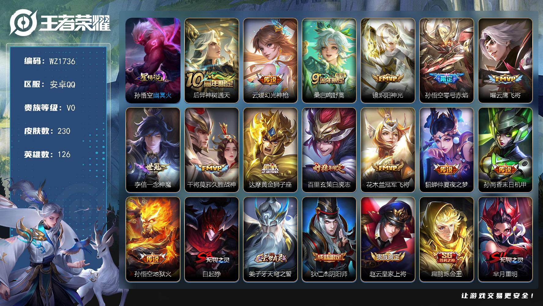 - [12152395]游走48段【特价急出/详情看图】:安卓Q-V10-永恒钻石IV段位-126英雄-459皮肤-7典藏-1无双-59传说-164史诗 【荣耀典藏】:武则天英雄,武则天倪克斯神谕,夏侯惇无限飓风号,李白鸣剑曳影,花木兰九霄神辉,铠银白咏叹调,貂蝉幻阙歌,韩信弑枪猎影 【无双皮肤】:武则天神器明辉仪 【传说皮肤】:艾琳觅芳踪,孙膑小动物乐团,大乔时之奇旅,吕布遇见神鼓,夏洛特浮生妄,花木兰燃星之曲,虞姬无限倾心,项羽无限倾心,伽罗炽翼辉光,孙悟空齐天大圣,小乔山海琳琅生,曜山海苍雷引,李信山海炽霜斩,吕布怒海麟威,李白诗剑行,不知火舞绯月行,王昭君星穹之声,娜可露露前尘镜,后羿无尽星芒,大乔挚爱花嫁,孙策挚爱之约,露娜启示之音,女娲补天,孙策末日机甲,瑶时之祈愿,裴擒虎寅虎赤拳,鲁班七号寅虎瑞焰,孙尚香异界灵契,貂蝉遇见胡旋,赵云淬星耀世,王昭君乞巧织情,西施游龙清影,曜李逍遥 ,周瑜音你心动,小乔音你心动,兰陵王默契交锋,公孙离祈雪灵祝,诸葛亮时雨天司,铠绛天战甲,镜炽阳神光,虞姬启明星使,孙悟空零号赤焰,李信一念神魔,干将莫邪久胜战神,虞姬云霓雀翎,达摩黄金狮子座,百里玄策白虎志,花木兰冠军飞将,梦奇胖达荣荣,后羿黄金射手座,杨戬永曜之星,诸葛亮武陵仙君,貂蝉仲夏夜之梦,李白凤求凰,孙尚香末日机甲,宫本武藏地狱之眼,吕布天魔缭乱,武则天海洋之心,狄仁杰超时空战士 【限定皮肤】:白起狰,狄仁杰阴阳师,小乔纯白花嫁,虞姬凯尔特女王,廉颇寅虎御盾,小乔山海琳琅生,赵云皇家上将,赵云引擎之心,赵云龙胆,墨子神迹守卫,墨子降魔,妲己热情桑巴,妲己时之奇旅,嬴政白昼王子,孙尚香蔷薇恋人,孙尚香异界灵契,鲁班七号狮舞东方,鲁班七号寅虎瑞焰,庄周云端筑梦师,庄周玄嵩,庄周高山流水,钟无艳王者之锤,钟无艳超时空战士,孙膑妖精王,孙膑天狼运算者,孙膑寅虎展翼,扁鹊炼金王,扁鹊奇幻香踪,白起夜都怪侠,芈月重明,芈月白晶晶,芈月幻夜卜梦,吕布天魔缭乱,吕布猎兽之王,吕布御风骁将,吕布遇见神鼓,周瑜真爱至上,元歌云间偶戏,元歌无心,甄姬幽恒,甄姬女儿国国王,甄姬游园惊梦,甄姬落雪兰心,曹操烛龙,典韦穷奇,典韦蓝屏警告,马可波罗逐梦之星,马可波罗暗影游猎,马可波罗山海玄木吟,狄仁杰魔术师,狄仁杰万华元夜,达摩星际陆战队,达摩沙漠行僧,项羽海滩派对,项羽霸王别姬,项羽无限倾心,老夫子航海奇遇记,关