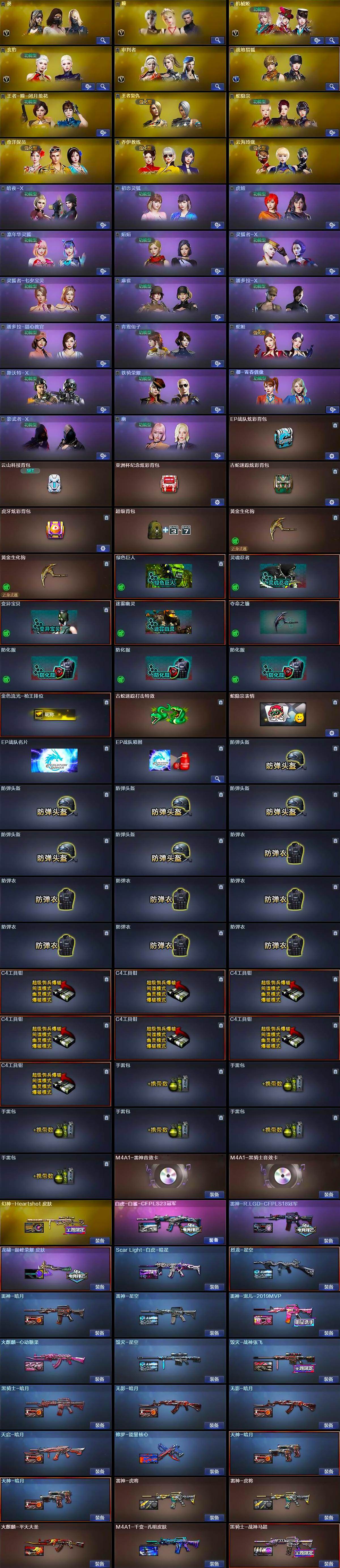 【皮肤】:幻神-Heartshot 皮肤,Scar Light-白虎-暗星,白虎-白鲨-CFPLS23冠军,烈龙-星空,雷神-暗月,雷神-星空,雷神-虎将*2,雷神-宠儿-2019MVP,雷神-R.LGD-CFPLS18冠军,火麒麟-平天大圣,火麒麟-心动糖果,毁灭-星空,毁灭-战神张飞,M4A1-千变-孔明皮肤,黑骑士-暗月,黑骑士-战神马超,无影-暗月*2,天启-暗月,修罗-能量核心,天神-暗月*2,龙啸-巅峰荣耀 皮肤