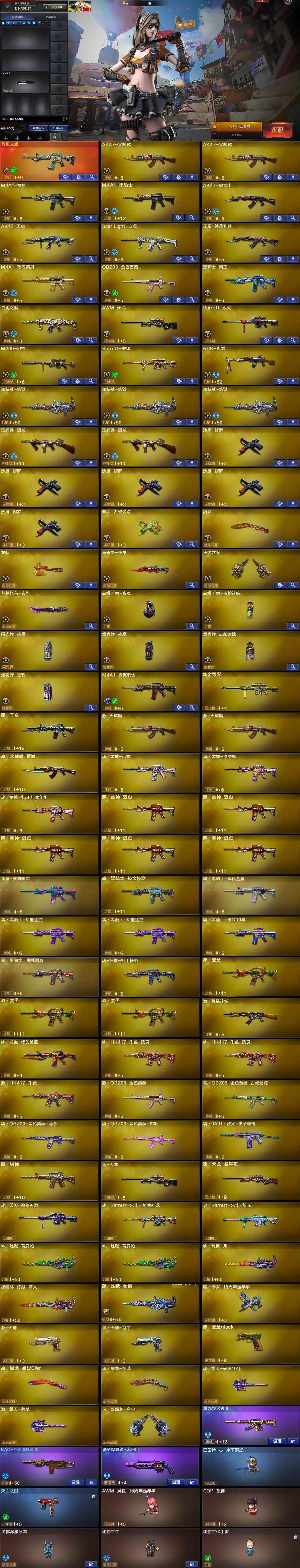【英雄级武器】:AK47-火麒麟*2,M4A1-雷神,M4A1-黑骑士,AK47-黑武士,AK12-天启,Scar Light-白虎,无影-神兵利器,M4A1-玫瑰精灵,QBZ03-金色蔷薇,黑骑士-海王,白虎之魄-觉醒版,AWM-天龙,Barrett-毁灭,M200-幻神,Barrett-朱雀,RPK-盘龙,加特林-炼狱*3,汤姆逊-烈龙*2,沙鹰-修罗*5,修罗-古蛇迷踪,屠龙,龙啸,马来剑-夜魔,王者之刺-觉醒版,丛林匕首-玄豹,高爆手雷-夜魔,高爆手雷-古蛇迷踪,闪光弹-夜魔,烟雾弹-夜魔,烟雾弹-古蛇迷踪,烟雾弹-玄豹,M4A1-赤狱骑士