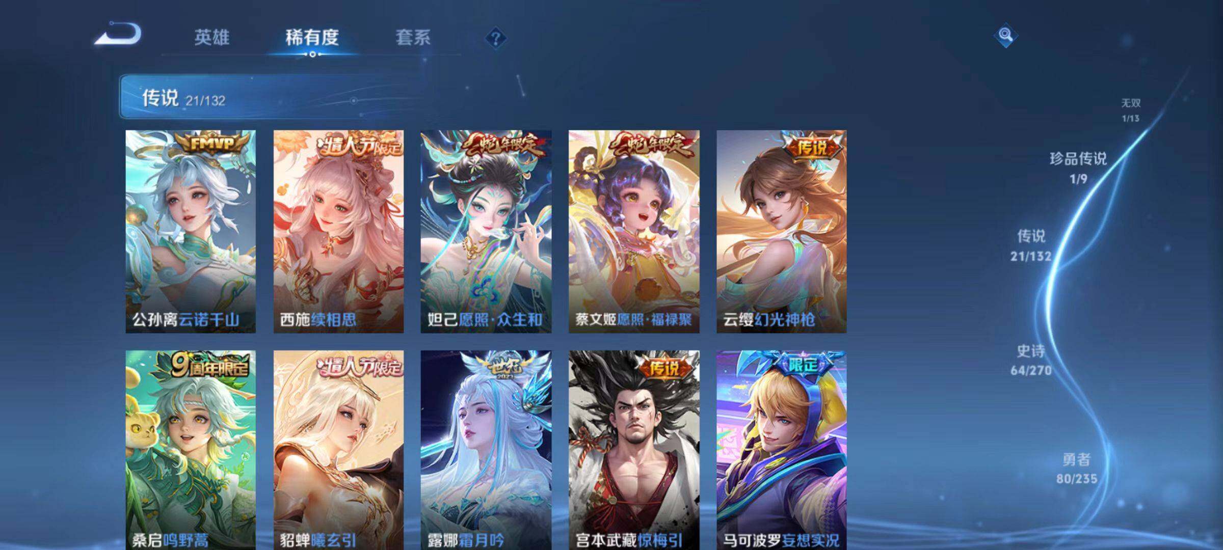 【传说皮肤】:公孙离云诺千山,西施续相思,妲己愿照众生和,蔡文姬愿照福禄聚,云缨幻光神枪,桑启鸣野蒿,貂蝉曦玄引,露娜霜月吟,宫本武藏惊梅引,马可波罗妄想实况,澜电玩雷克斯,露娜启示之音,王昭君乞巧织情,西施游龙清影,小乔音你心动,虞姬启明星使,曜云鹰飞将,刘备时之恋人,貂蝉猫影幻舞,貂蝉仲夏夜之梦,孙尚香末日机甲