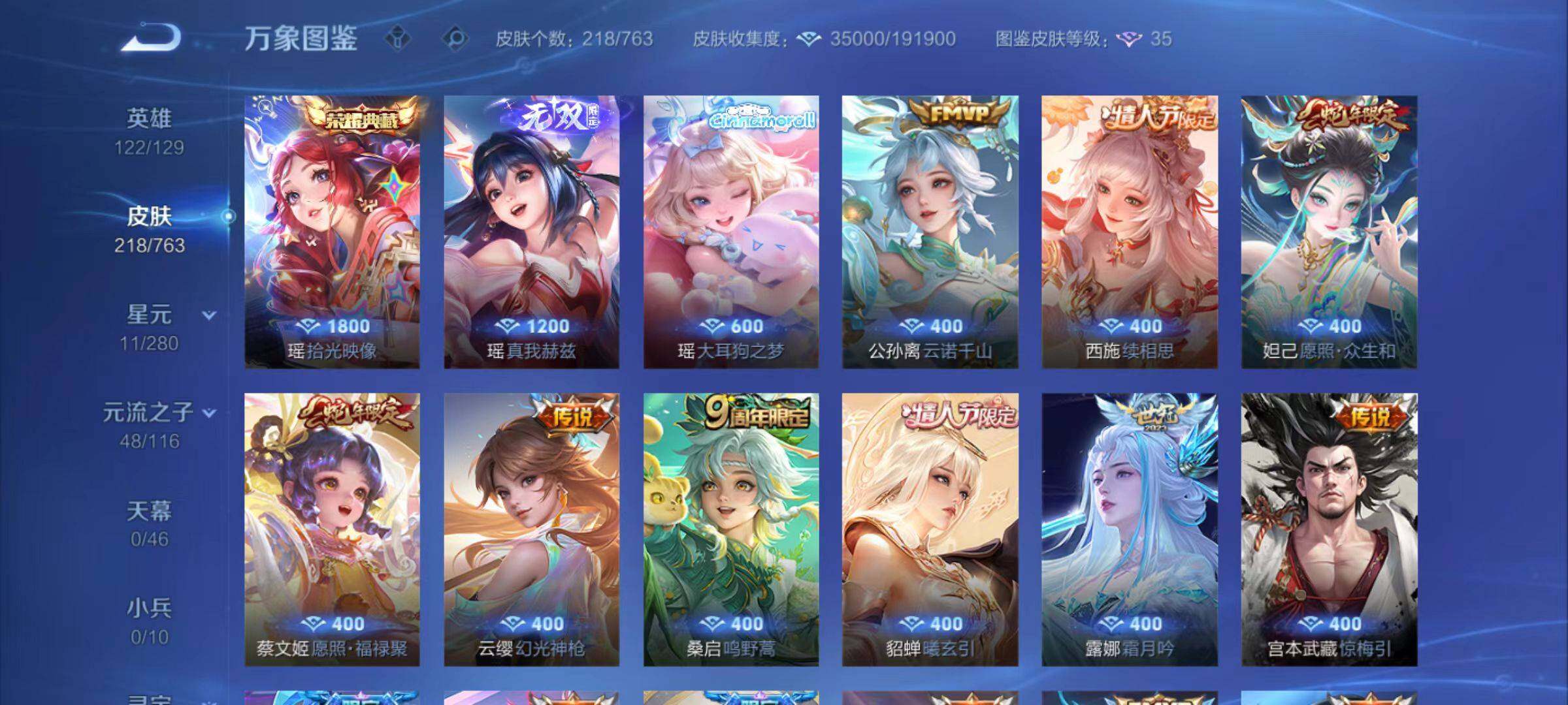 【史诗皮肤】:露娜紫霞仙子,赵云皇家上将,甄姬冰雪圆舞曲,狄仁杰魔术师,宫本武藏鬼剑武藏,孙尚香水果甜心,嬴政暗夜贵公子,妲己魅力维加斯,妲己女仆咖啡,墨子龙骑士,刘禅绅士熊喵,张飞乱世虎臣,貂蝉逐梦之音,花木兰水晶猎龙者,刘邦德古拉伯爵,夏侯惇乘风破浪,小乔缤纷独角兽,雅典娜冰冠公主,百里守约特工魅影,蔡文姬舞动绿茵,李元芳逐浪之夏,阿轲节奏热浪,大乔猫狗日记,狄仁杰鹰眼统帅,公孙离无限星赏官,小乔青蛇,不知火舞魅语,橘右京修罗,瑶遇见神鹿,元歌云间偶戏,芈月白晶晶,西施诗语江南,百里玄策热力回旋,沈梦溪月团寄思,安琪拉时之奇旅,司马懿暗渊魔法,镜匿光