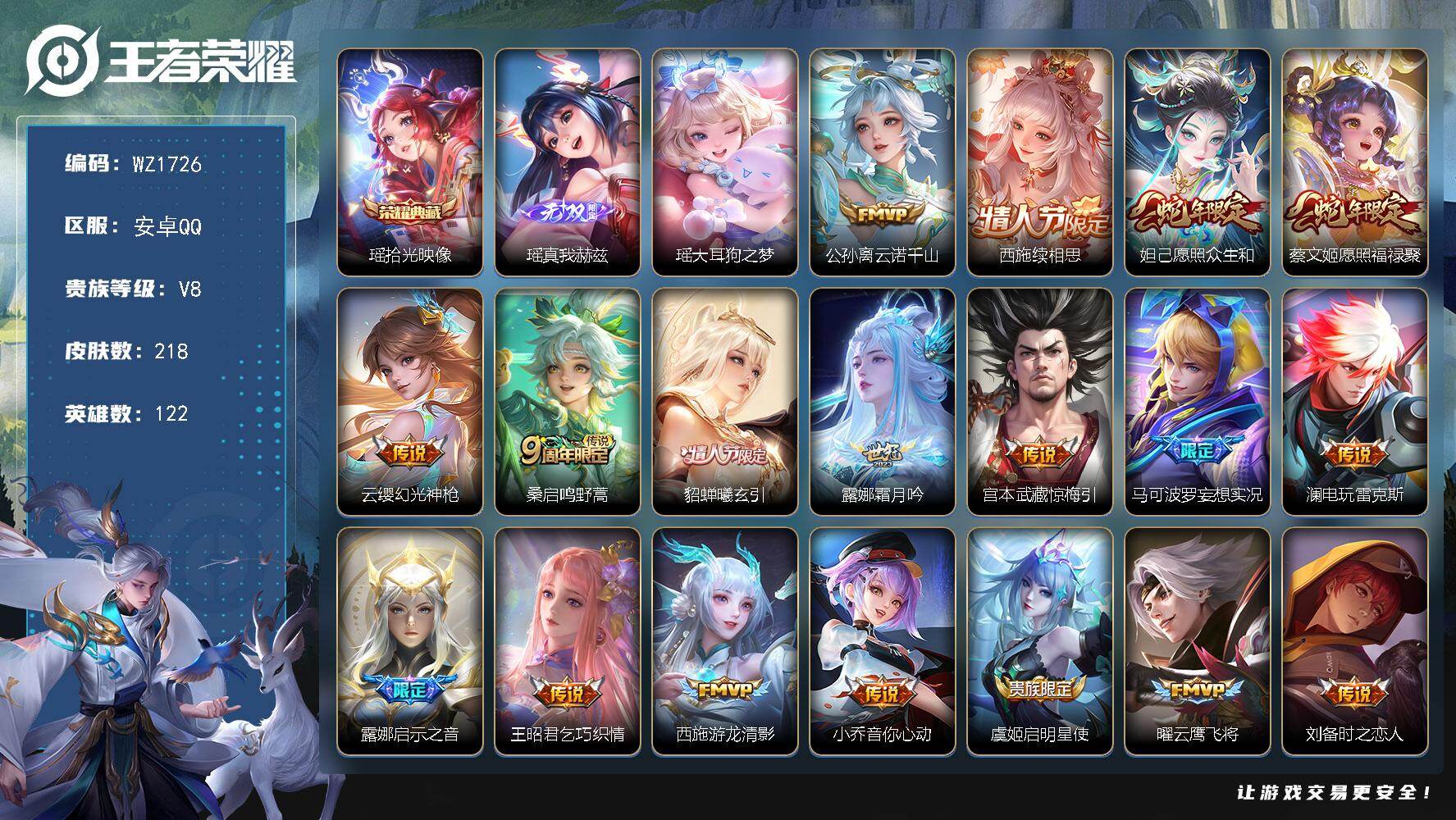 [16727011]安卓Q-V8-218皮肤-1典藏皮肤-1无双-1珍品传说-21传说-63史诗 【英雄全皮】:空空儿全皮,影全皮,少司缘全皮 【荣耀典藏】:瑶拾光映像 【无双皮肤】:瑶真我赫兹 【珍品传说】:瑶大耳狗之梦 【传说皮肤】:公孙离云诺千山,西施续相思,妲己愿照众生和,蔡文姬愿照福禄聚,云缨幻光神枪,桑启鸣野蒿,貂蝉曦玄引,露娜霜月吟,宫本武藏惊梅引,马可波罗妄想实况,澜电玩雷克斯,露娜启示之音,王昭君乞巧织情,西施游龙清影,小乔音你心动,虞姬启明星使,曜云鹰飞将,刘备时之恋人,貂蝉猫影幻舞,貂蝉仲夏夜之梦,孙尚香末日机甲 【限定皮肤】:虞姬夏日便利店,姜子牙天穹之誓,狄仁杰阴阳师,赵云皇家上将,妲己时之奇旅,芈月白晶晶,元歌云间偶戏,马可波罗妄想实况,狄仁杰魔术师,项羽海滩派对,貂蝉逐梦之音,露娜启示之音,虞姬启明星使,瑶山海碧波行,西施玲珑珍味,镜匿光追影者,张良古海寻踪,鬼谷子天穹祈灯,姬小满妄想食味,安琪拉乘龙聚宝船,貂蝉曦玄引,沈梦溪龙舞盛年,刘邦剑破天穹,上官婉儿群星魔术团,程咬金群星魔术团,项羽苍威无极,周瑜熔金海岸 【年限皮肤】:瑶山海碧波行,安琪拉乘龙聚宝船,妲己愿照众生和,蔡文姬愿照福禄聚 【赛季限定】:张良古海寻踪,鬼谷子天穹祈灯,刘邦剑破天穹,姜子牙天穹之誓,东皇太一噬灭天穹,太乙真人谧流熔炉,钟馗虚灵犬护,甄姬逆浪荇歌,亚瑟荣光之誓 【战令限定】:元歌云间偶戏,西施玲珑珍味,项羽苍威无极,虞姬夏日便利店,亚连破空之剑,孙悟空神迹守卫,百里守约百相守梦,老夫子百相守梦,孙膑茶境仙,马超访茗客,刘禅鸭鸭历险记,沈梦溪鸭鸭历险记,周瑜百相守梦,孙策百相守梦,莱西奥光弋星穹,明世隐往忆晖光,周瑜线条小狗 【史诗皮肤】:露娜紫霞仙子,赵云皇家上将,甄姬冰雪圆舞曲,狄仁杰魔术师,宫本武藏鬼剑武藏,孙尚香水果甜心,嬴政暗夜贵公子,妲己魅力维加斯,妲己女仆咖啡,墨子龙骑士,刘禅绅士熊喵,张飞乱世虎臣,貂蝉逐梦之音,花木兰水晶猎龙者,刘邦德古拉伯爵,夏侯惇乘风破浪,小乔缤纷独角兽,雅典娜冰冠公主,百里守约特工魅影,蔡文姬舞动绿茵,李元芳逐浪之夏,阿轲节奏热浪,大乔猫狗日记,狄仁杰鹰眼统帅,公孙离无限星赏官,小乔青蛇,不知火舞魅语,橘右京修罗,瑶遇见神鹿,元歌云间偶戏,芈月白晶晶,西施诗语江南,百里玄策热力回旋,沈梦溪月团寄思,安琪拉时之奇旅,司马懿暗渊魔法,镜匿光