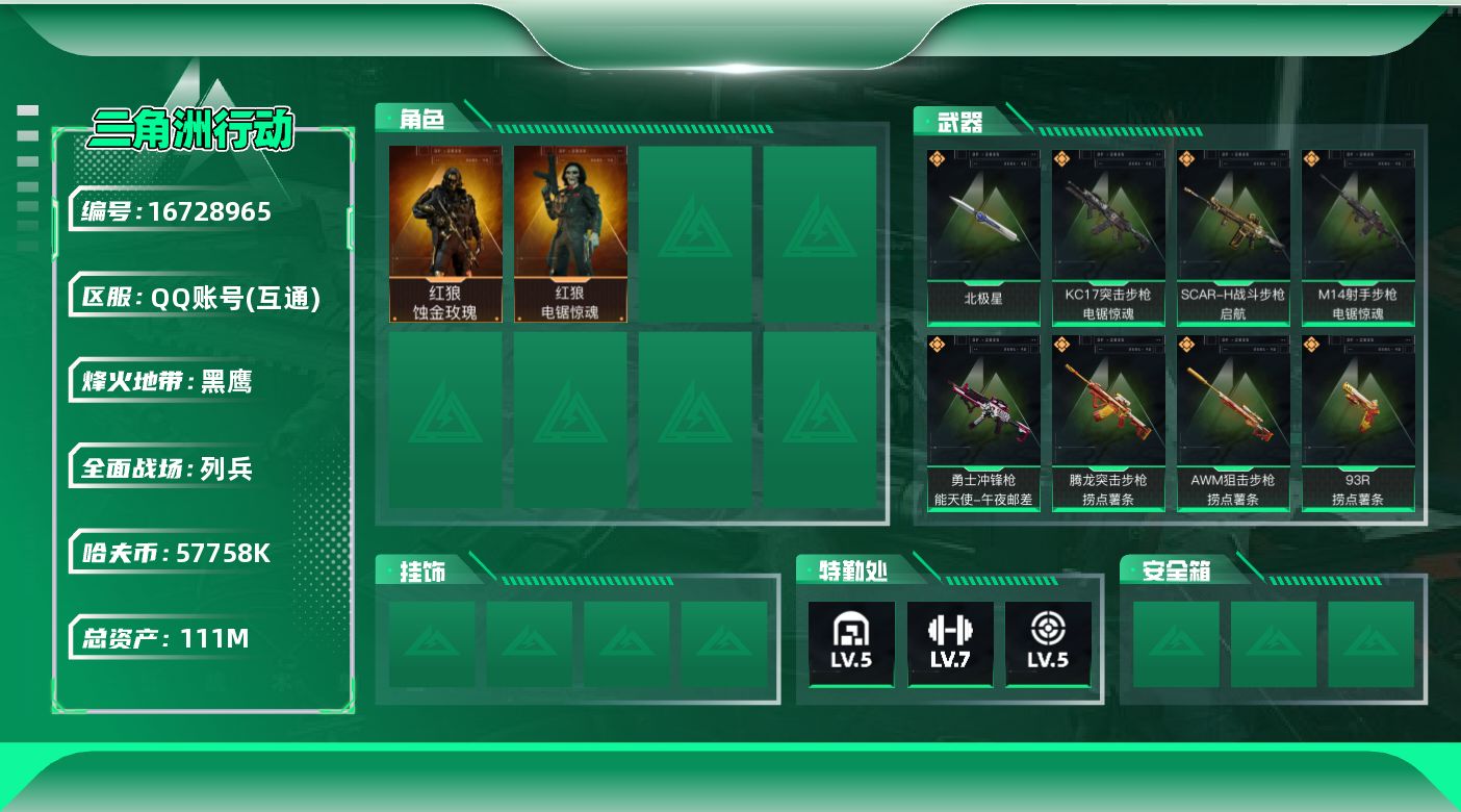 [16728965]可二次【特价出售/店主推荐】 111m总资产-57758k哈伏币-60烽火等级-黑鹰-11战场等级-列兵 【干员外观】:红狼-蚀金玫瑰,红狼-电锯惊魂 【近战皮肤】:近战-北极星,近战-黑鹰 【传说外观】:M4A1突击步枪-蚀金玫瑰,M4A1突击步枪-阿米娅,AK-12突击步枪-特斯拉线圈,SCAR-H战斗步枪-启航,CAR-15突击步枪-阿米娅,腾龙突击步枪-捞点薯条,K437突击步枪-北极星,KC17突击步枪-电锯惊魂,UZI冲锋枪-特斯拉线圈,SR-3M紧凑突击步枪-特斯拉线圈,勇士冲锋枪-能天使-午夜邮差,QCQ171冲锋枪-北极星,M14射手步枪-电锯惊魂,AWM狙击步枪-捞点薯条,93R-捞点薯条,复合弓-黑·天际线 【史诗外观】:AKM突击步枪-林中猎手,M16A4突击步枪-竞赛选手,SCAR-H战斗步枪-囚徒,MP5冲锋枪-战术竞备,MP5冲锋枪-竞技风,SR-3M紧凑突击步枪-战术竞备,勇士冲锋枪-深海恐惧,M1014霰弹枪-林中猎手,PKM通用机枪-蝮蛇,M250通用机枪-囚徒,SVD狙击步枪-阿萨拉工艺,SVD狙击步枪-暗夜猎手,SV-98狙击步枪-林中猎手,SV-98狙击步枪-囚徒,SV-98狙击步枪-猎鳄行动,M700狙击步枪-蝮蛇,沙漠之鹰-曙光 【稀有外观】:M14射手步枪-花岗岩,AKM突击步枪-肃杀,M7战斗步枪-捣蛋鬼,SCAR-H战斗步枪-童趣,SCAR-H战斗步枪-荣耀列队,PTR-32突击步枪-天网,PTR-32突击步枪-英雄,CAR-15突击步枪-前沿科技,腾龙突击步枪-冰天雪地,MP5冲锋枪-弄臣,MP5冲锋枪-虎啸,P90冲锋枪-浅鲨小队,P90冲锋枪-新生,P90冲锋枪-黄昏,Vector冲锋枪-先锋,UZI冲锋枪-前沿科技,UZI冲锋枪-亚特兰蒂斯,野牛冲锋枪-前沿科技,SMG-45-行动开启,SMG-45冲锋枪-幻影结构,SMG-45冲锋枪-天网,MP7冲锋枪-幻影结构,M1014霰弹枪-幻影结构,M250通用机枪-天网,QJB201轻机枪-哈夫克卫队,Mini-14射手步枪-荣耀列队,VSS射手步枪-童趣,SKS射手步枪-弄臣,SR-25射手步枪-开拓,SR-9射手步枪-街头涂鸦,G18-星链科技,G18-哈夫克航天 【普通外观】:M14射手步枪-蛇纹涂装,MP5冲锋枪-古铜,M4A1突击步枪-粉色涂装,M4