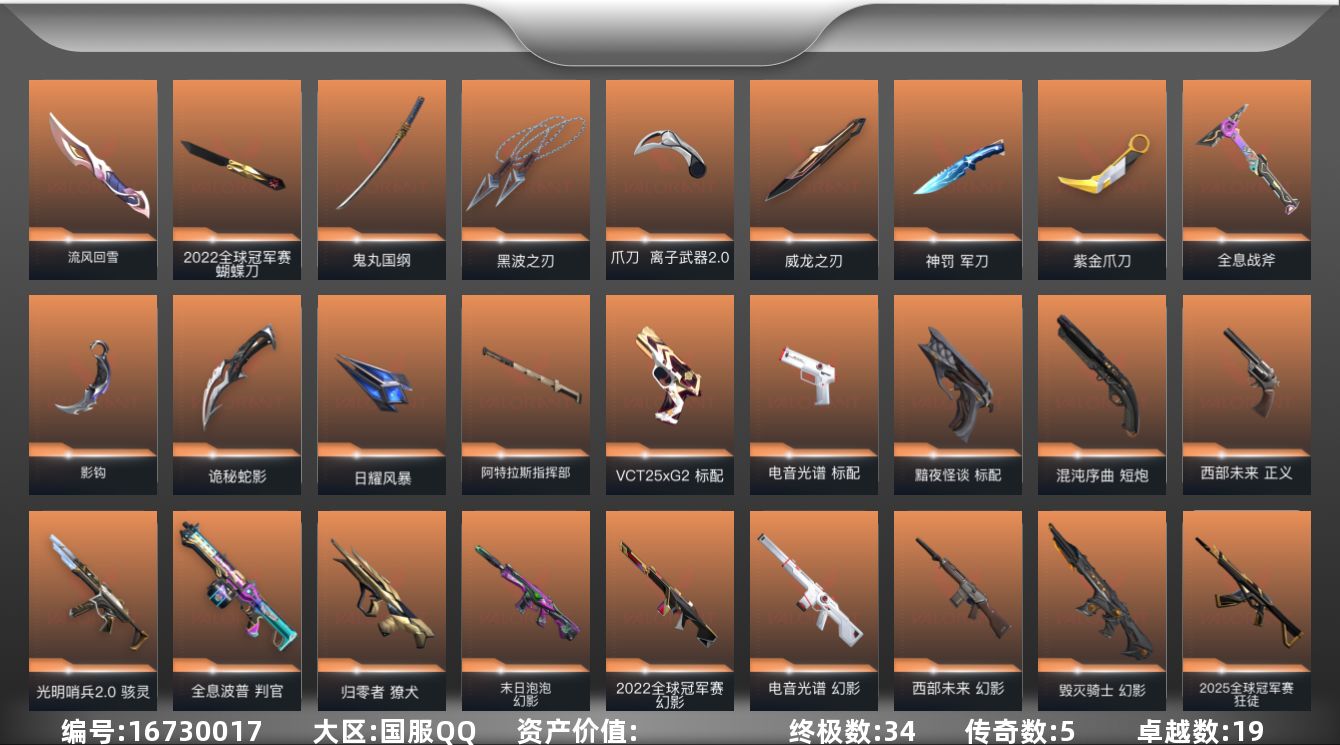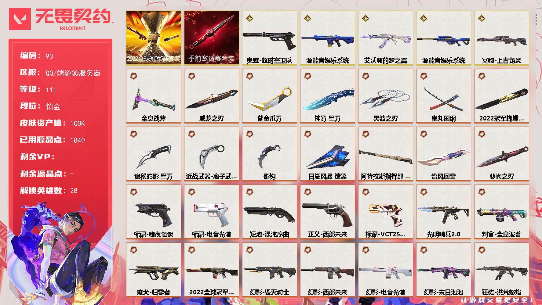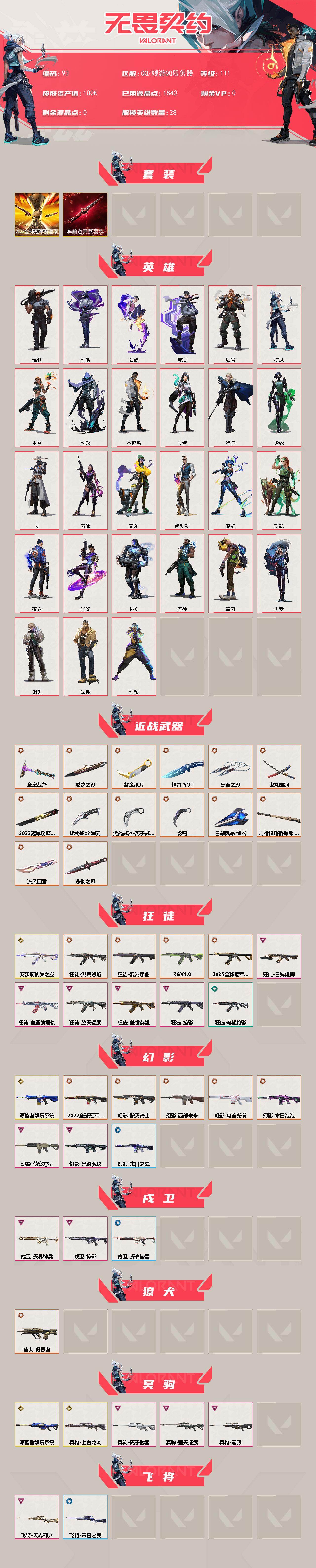 [16730017]【93】【套装】:2022全球冠军赛套装,无畏契约季前邀请赛套装 【英雄】:幻棱,炼狱,维斯,暮蝶,钛狐,壹决,铁臂,捷风,雷兹,幽影,不死鸟,贤者,猎枭,蝰蛇,零,芮娜,奇乐,尚勃勒,霓虹,斯凯,夜露,星礈,K/O,海神,盖可,黑梦,钢锁 【近战武器】:近战武器-2022全球冠军赛 蝴蝶刀,近战武器-无畏契约季前邀请赛 悲悯之刃,近战武器-流风回雪,近战武器-影钩,近战武器-紫金爪刀,近战武器-黑波之刃,近战武器-威龙之刃,近战武器-鬼丸国纲,近战武器-离子武器//2.0 爪刀,近战武器-全息战斧,近战武器-神罚 军刀,近战武器-诡秘蛇影 军刀,近战武器-日耀风暴 遗器,近战武器-阿特拉斯指挥部 甩棍 【狂徒】:狂徒-艾沃莉的梦之翼,狂徒-2025全球冠军赛,狂徒-洪荒怒焰,狂徒-混沌序曲,狂徒-RGX 11z Pro,狂徒-堕天遗武,狂徒-掠影,狂徒-盖世英雄,狂徒-盖亚的复仇,狂徒-日冕雄师,狂徒-诡秘蛇影 【幻影】:幻影-源能者娱乐系统,幻影-2022全球冠军赛,幻影-毁灭骑士,幻影-西部未来,幻影-电音光谱,幻影-末日泡泡,幻影-侦察力量,幻影-异鳞魔蛇,幻影-末日之翼,幻影-西部未来,幻影-电音光谱 【戍卫】:戍卫-掠影,戍卫-天界神兵,戍卫-折光棱晶 【獠犬】:獠犬-归零者 【冥驹】:冥驹-源能者娱乐系统,冥驹-上古龙炎,冥驹-堕天遗武,冥驹-离子武器,冥驹-起源 【飞将】:飞将-天界神兵,飞将-末日之翼 【莽侠】:莽侠-归零者//2.0,莽侠-诡秘蛇影 【奥丁】:奥丁-西部未来,奥丁-末日之翼 【判官】:判官-全息波普,判官-诡秘蛇影 【雄鹿】:雄鹿-紫阙金琅//2.0 【骇灵】:骇灵-光明哨兵//2.0 【蜂刺】:蜂刺-天界神兵,蜂刺-折光棱晶 【标配】:标配-黯夜怪谈,标配-电音光谱,标配-折光棱晶,标配-电音光谱 【VCT手枪】:标配-VCT25 x G2 【正义】:正义-西部未来 【鬼魅】:鬼魅-超时空卫队,鬼魅-盖亚的复仇,鬼魅-天界神兵,鬼魅-耀鳞威龙,鬼魅-掠影//2.0,鬼魅-诡秘蛇影 【短炮】:短炮-混沌序曲,短炮-末日之翼 【卡面】:树懒大作战 卡面,Clutch 卡面,无垠星环 卡面,《双城之战》金克丝 卡面,完美调谐 卡面 ,钢锁vs盖可 卡面,代号红色 卡面,新兵报到 卡面,V契约 卡面,无畏契约 卡面 【喷漆】:加油!加