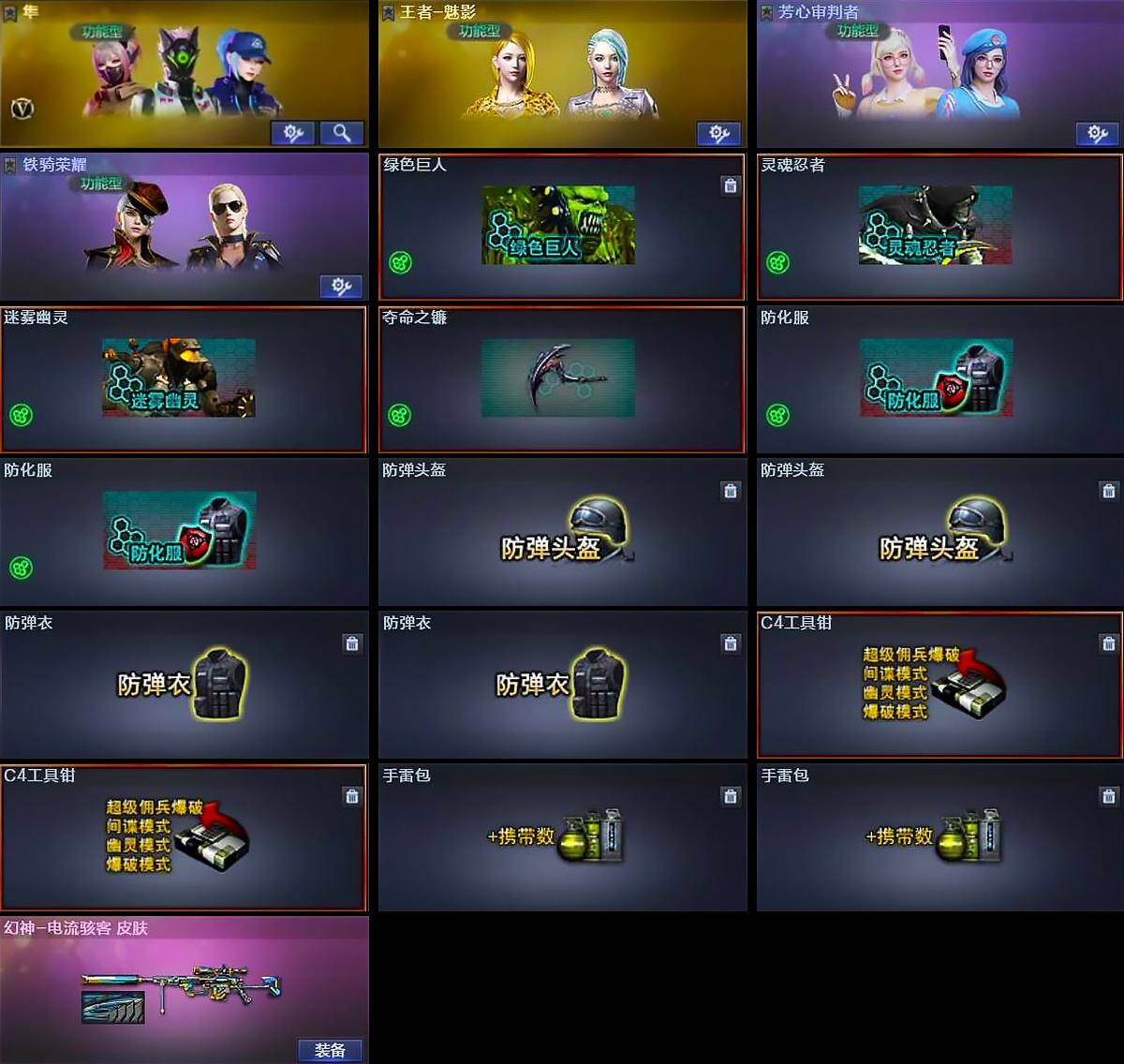 【道具】:绿色巨人,灵魂忍者,迷雾幽灵,夺命之镰,防化服*2,防弹头盔*2,防弹衣*2,C4工具钳*2,手雷包*2