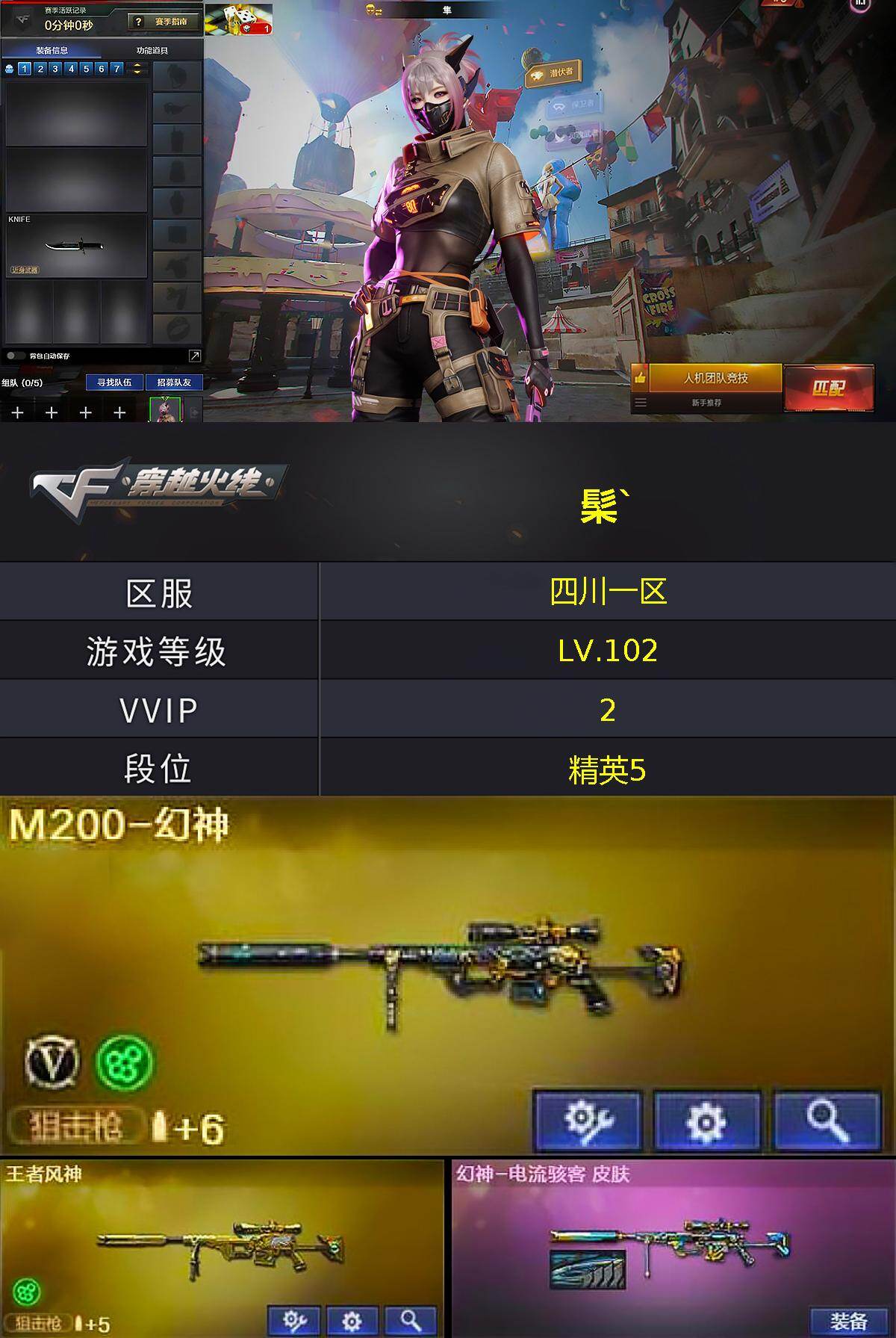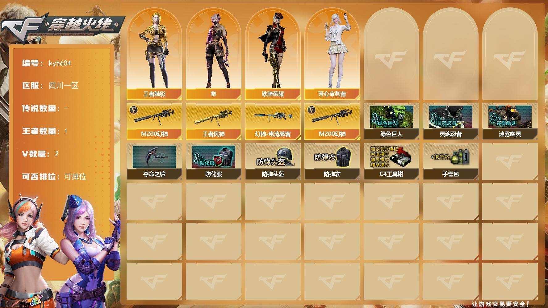 [16730081]四川一区-2V-1王者武器数-0炫金武器数 【热门武器】:M200-幻神 【王者炫金武器】:王者风神 【皮肤】:幻神-电流骇客 皮肤 【角色】:隼,王者-魅影,芳心审判者,铁骑荣耀 【英雄级武器】:M200-幻神 【道具】:绿色巨人,灵魂忍者,迷雾幽灵,夺命之镰,防化服*2,防弹头盔*2,防弹衣*2,C4工具钳*2,手雷包*2 【特殊枪械】: