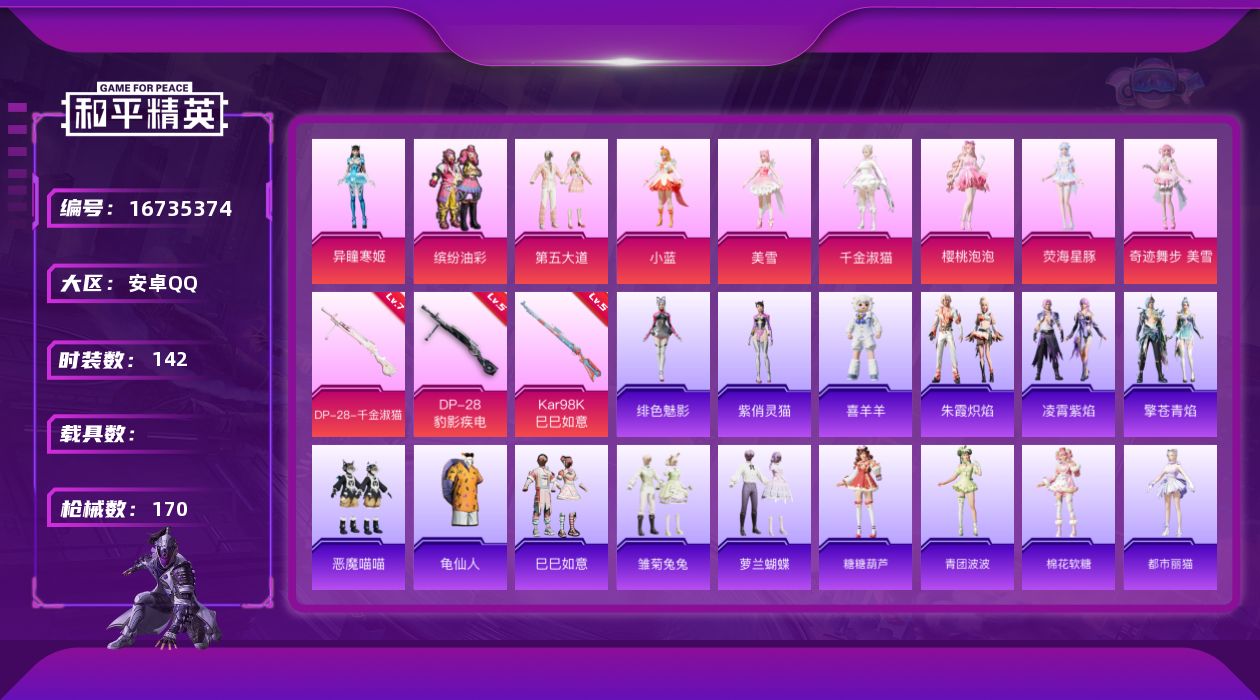[16735374]【店主推荐捡漏号!可直接换绑】安卓 手Q-9粉装-3特效枪-0载具-1粉色飞行器-51385热力值-9王牌印记-142套装-170枪皮【热门品类】:粉装-缤纷油彩,套装-龟仙人【粉色套装】:粉装-缤纷油彩,粉装-第五大道,角色-小蓝,角色-美雪,角色-千金淑猫,角色-樱桃泡泡,角色-荧海星豚,角色-奇迹舞步 美雪,角色-异瞳寒姬【粉色枪皮等级】:Kar98K-巳巳如意(五级),DP-28-千金淑猫(七级),DP-28-豹影疾电(五级)【粉色枪皮】:Kar98K-巳巳如意,DP-28-千金淑猫,DP-28-豹影疾电