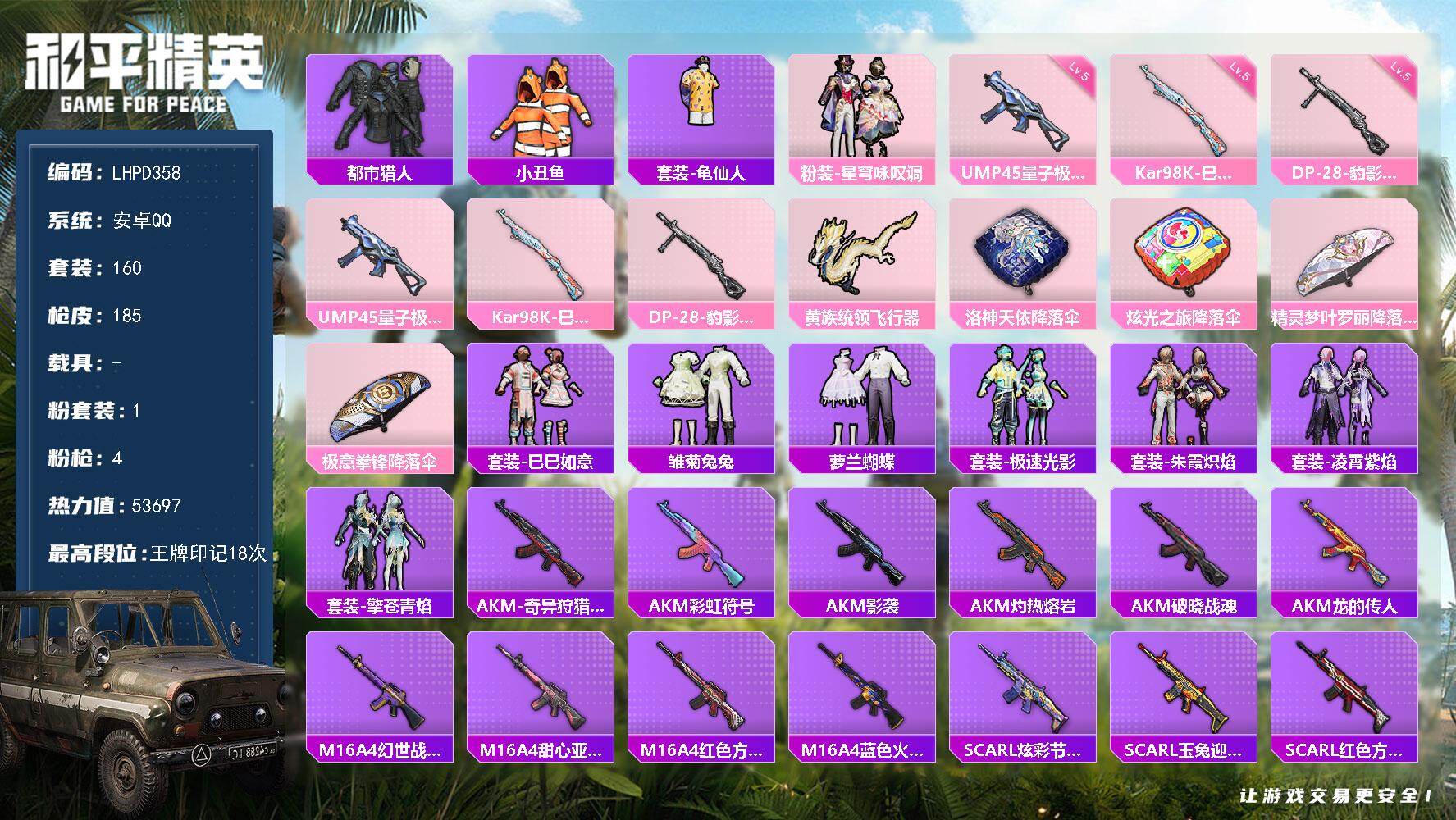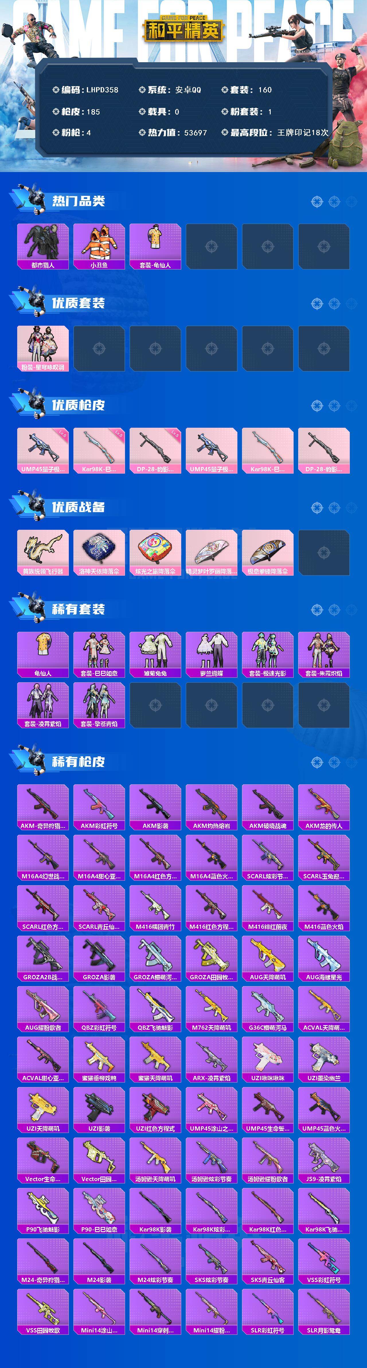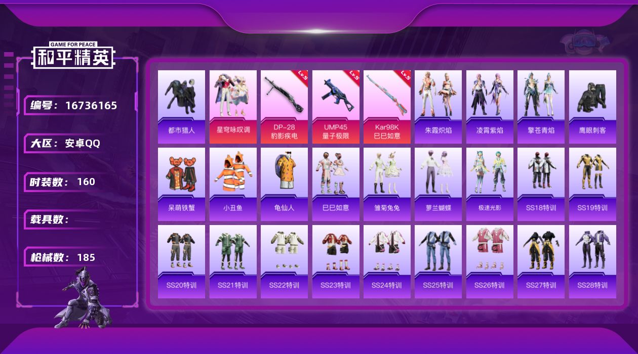 [16736165]连体王者【特价出售/安卓 手Q-1粉装-4特效枪-0载具-2粉色飞行器-53697热力值-18王牌印记-160套装-185枪皮【热门品类】:套装-都市猎人,套装-小丑鱼,套装-龟仙人【粉色套装】:粉装-星穹咏叹调【粉色枪皮等级】:UMP45-量子极限(五级),Kar98K-巳巳如意(五级),DP-28-豹影疾电(五级)【粉色枪皮】:UMP45-量子极限,Kar98K-巳巳如意,DP-28-豹影疾电【粉色飞行器】:黄族统领飞行器