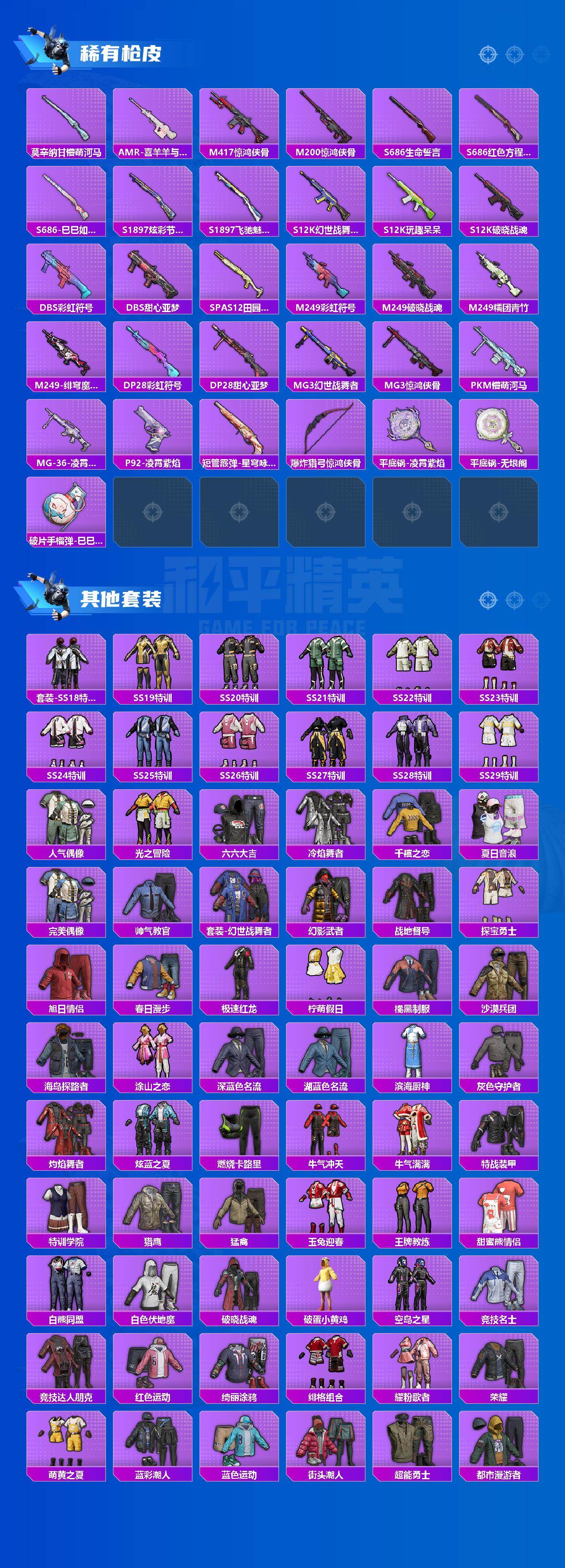 - [12089326]12粉装 8特效枪 9印记 可二次 可修改实名 女号 优质装备:智能音符,缤纷油彩(猪妹猪脸妹),AUG星之彼岸,七级AUG-星之彼岸,千金淑猫,M416-女娲灵识,晶梦幻蝶,雪月幻音,智耀战神,AMR-智耀战神,破片手榴弹-瓶中星球,星穹咏叹调,AKS-74U-星穹咏叹调,MG3-辉羽雀灵,幻彩电音,MG-36-幻彩电音,Kar98K-巳巳如意 热门装扮:山涧鹿灵,绚金瑰梦,精灵娃娃,恐龙拽拽,兔兔白日梦,浪漫波比 六级特效枪:六级破片手榴弹-瓶中星球 五级特效枪:五级Kar98K-巳巳如意,五级AMR-智耀战神 四级特效枪:四级MG-36-幻彩电音,四级AKS-74U-星穹咏叹调 三级特效枪:三级M416-女娲灵识,三级MG3-辉羽雀灵 紫色装扮:田园牧歌,轻风白浪,和煦暖阳,SS22特训,白兰地假日,娇憨猪猪,梦幻奶油,萌趣咩咩,暖心熊熊,SS21特训,SS31特训套装,人气偶像,冷焰舞者,霓虹热舞,极速光影,SS30特训套装,云朵鹅,彩虹兔,雪绒豹,SS33特训套装,顶瓜瓜,时希公主,SS20特训,青春冒险家,潮流游乐家,暗夜傀儡,闪银刀客,时空追击者,暴风机械师,SS16特训,冰爽风暴,爆裂葡萄,遗落祭司,特种颜团子,猎梦纪元,飞驰魅影,音速流光,极速竞梦,SS19特训,粉团憨憨,软羊咩咩,吉莉礼服,甜心亚梦,虚音幻奏,瑞龙福将,团圆交子,醒狮腾龙,SS17特训,绿翡凌光,月蓝流光,异彩先驱,SS18特训,水晶王族,都市魅力,酒红色名流,长空猛禽,霓虹极客,霓虹街区,青年教官,缤纷果语,耀眼新星,蓝彩潮人,蓝色运动,虎虎生威吉莉,街头潮人,飞行日记,魅力单车,麻辣教官,黄色伏地魔,黄色名流,黄色运动,黎明保卫者,黑色伏地魔,极速红龙,柠萌假日,格斗先锋,深蓝色名流,幻影武者,夏日音浪,完美偶像,帅气教官,幻世战舞者,战地菁英,探宝勇士,湖蓝色名流,绮丽涂鸦,疯狂小兔子,白色伏地魔,破晓战魂,破蛋小黄鸡,甜蜜告白,福星高照,空投萌叽,突袭者,竞技达人朋克,红色运动,甜蜜熊情侣,牛气冲天,灰色格斗者,灼焰舞者,炫蓝之夏,牛气满满,猛禽,猎鹰,短笛,星途旅人,迎夏光舞,石蕴玉辉,鱼渊荷华,玉兔迎春,燕燕于飞,巳巳如意,航行童话,暗械蛇影,海琴烟,风玲,迷雾之月,熊抱抱,红熊茄茄,都市丽猫,青团波波,糖糖葫芦,棉花软糖,竞技名士,摩登魅猫,小狗蛇点点