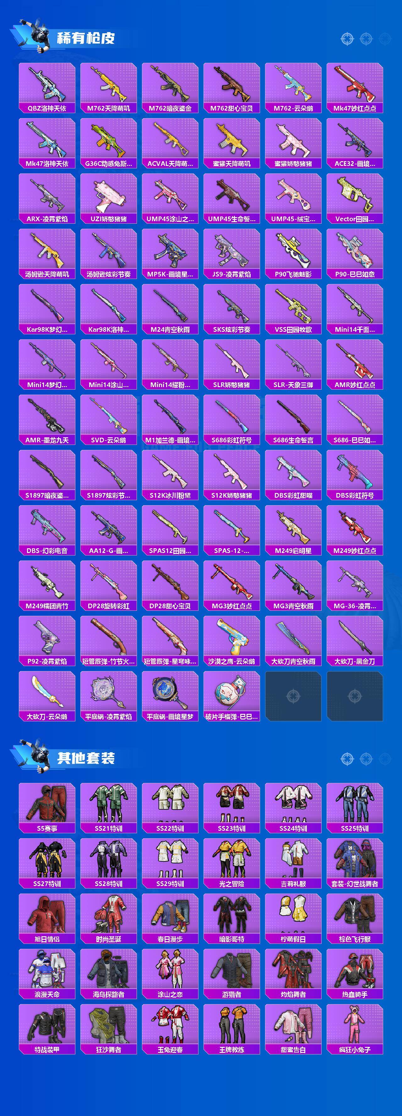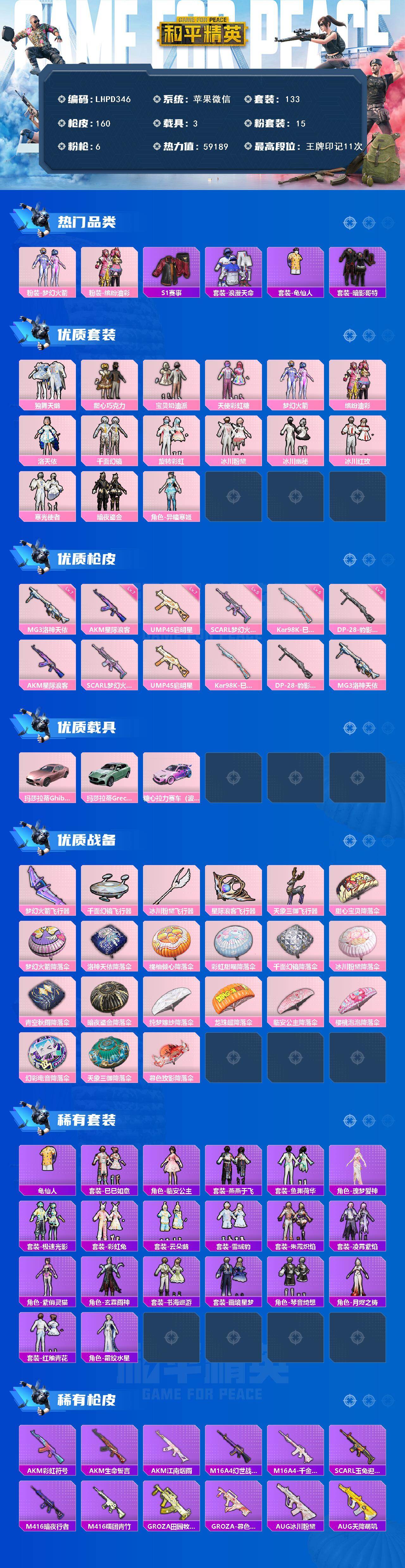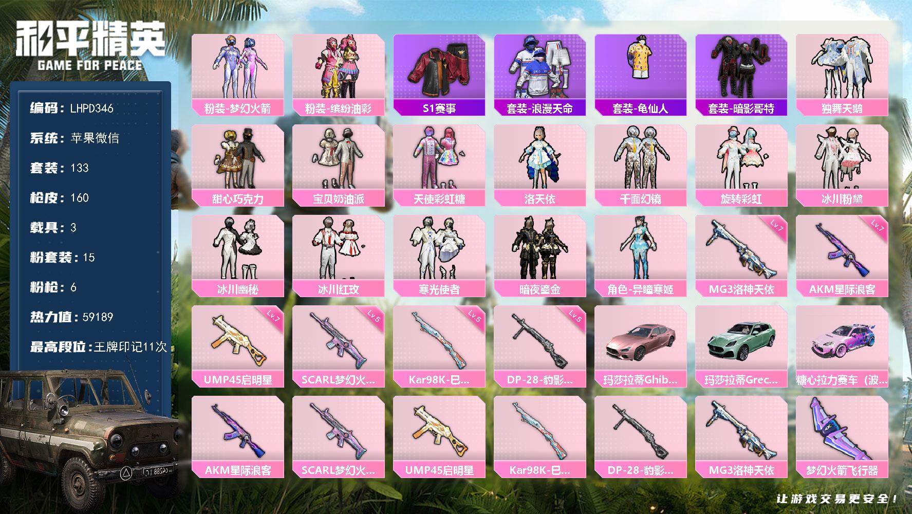 [16736252]【特价出售/店主推荐】苹果 微信-15粉装-6特效枪-3载具-5粉色飞行器-59189热力值-11王牌印记-133套装-160枪皮【热门品类】:粉装-梦幻火箭,粉装-缤纷油彩,套装-S1赛事,套装-浪漫天命,套装-龟仙人,套装-暗影哥特【粉色套装】:粉装-独舞天鹅,粉装-甜心巧克力,粉装-宝贝奶油派,粉装-天使彩虹糖,粉装-梦幻火箭,粉装-缤纷油彩,角色-洛天依,粉装-千面幻镜,粉装-旋转彩虹,粉装-冰川粉黛,粉装-冰川幽秘,粉装-冰川红玫,粉装-寒光使者,粉装-暗夜鎏金,角色-异瞳寒姬【粉色枪皮等级】:AKM-星际浪客(七级),SCAR-L-梦幻火箭(五级),UMP45-启明星(七级),Kar98K-巳巳如意(五级),DP-28-豹影疾电(五级),MG3-洛神天依(七级)【粉色载具】:玛莎拉蒂Ghibli(粉),玛莎拉蒂Grecale(薄荷绿),糖心拉力赛车(波动紫)【粉色枪皮】:AKM-星际浪客,SCAR-L-梦幻火箭,UMP45-启明星,Kar98K-巳巳如意,DP-28-豹影疾电,MG3-洛神天依【粉色飞行器】:梦幻火箭飞行器,千面幻镜飞行器,冰川粉黛飞行器,星际浪客飞行器,天象三御飞行器