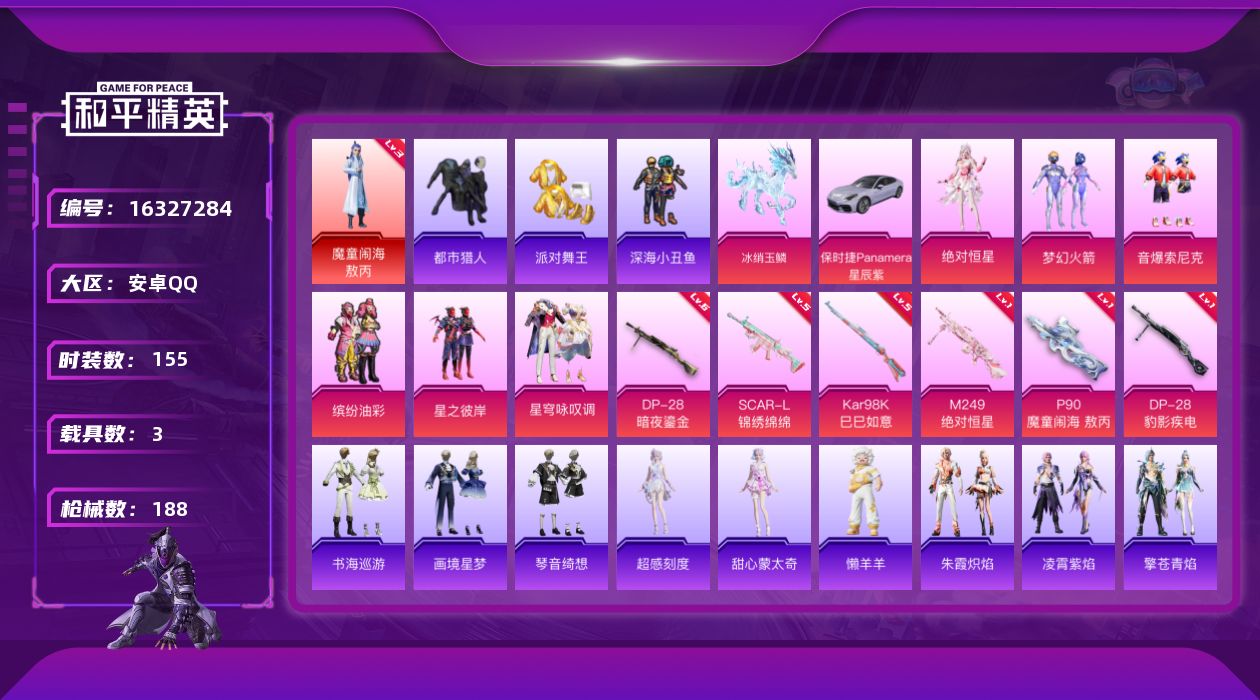 [16327284]【特价出售/店主推荐】安卓 手Q-1神装-6粉装-6特效枪-3载具-5粉色飞行器-65225热力值-5王牌印记-155套装-188枪皮【红色神装等级】:魔童闹海-敖丙(三级)【红色角色神装】:魔童闹海-敖丙【热门品类】:粉装-梦幻火箭,粉装-音爆索尼克,粉装-缤纷油彩,套装-浪漫天命,套装-都市猎人,套装-派对舞王,套装-深海小丑鱼,套装-龟仙人,套装-暗影哥特,套装-浪漫波比,套装-粉红小猪【粉色套装】:角色-绝对恒星,粉装-梦幻火箭,粉装-缤纷油彩,粉装-星之彼岸,粉装-音爆索尼克,粉装-星穹咏叹调【粉色枪皮等级】:SCAR-L-锦绣绵绵(五级),P90-魔童闹海 敖丙(一级),Kar98K-巳巳如意(五级),M249-绝对恒星(一级),DP-28-暗夜鎏金(六级),DP-28-豹影疾电(一级)【粉色载具】:保时捷Panamera(星辰紫),僚机-冰龙团团,冰绡玉鳞【粉色枪皮】:SCAR-L-锦绣绵绵,P90-魔童闹海 敖丙,Kar98K-巳巳如意,M249-绝对恒星,DP-28-暗夜鎏金,DP-28-豹影疾电【粉色飞行器】:绝对恒星飞行器,动力核心飞行器,飞天猪飞行器,灵珠游龙飞行器