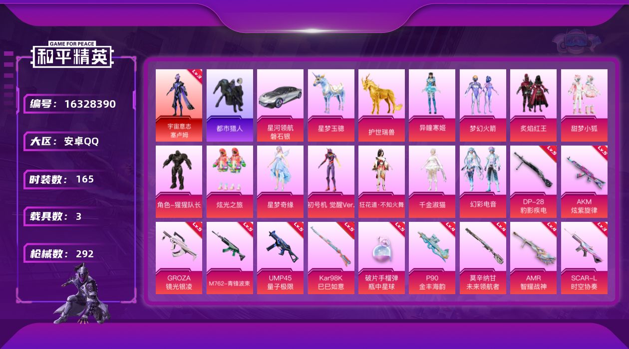 [16328390]【特价出售/店主推荐】安卓 手Q-无敌战神框-1神装-11粉装-17特效枪-3载具-15粉色飞行器-93808热力值-13王牌印记-165套装-292枪皮【红色神装等级】:宇宙意志-塞卢姆(三级)【红色角色神装】:宇宙意志-塞卢姆【热门品类】:粉装-梦幻火箭,套装-都市猎人,套装-金羽特工,套装-龟仙人,套装-粉红小猪,角色-8号机,角色-Mark.06【粉色套装】:粉装-梦幻火箭,粉装-炙焰红王,粉装-甜梦小狐,角色-猩猩队长,粉装-炫光之旅,角色-星梦奇缘,角色-初号机 觉醒Ver.,角色-狂花道·不知火舞,角色-千金淑猫,粉装-幻彩电音,角色-异瞳寒姬【粉色枪皮等级】:AKM-炫紫旋律(五级),SCAR-L-时空协奏(三级),M416-墨龙九天(三级),GROZA-镜光银凌(五级),M762-青锋波束(五级),蜜獾-异瞳寒姬(二级),UMP45-量子极限(五级),UMP45-宇宙意志(三级),P90-沙丘之主(三级),P90-金丰海韵(四级),Kar98K-巳巳如意(五级),Kar98K-圣域龙灵(三级),Mk14-盛世惊鸿(三级),莫辛纳甘-未来领航者(四级),AMR-智耀战神(四级),DP-28-豹影疾电(五级),破片手榴弹-瓶中星球(五级)【粉色载具】:星河领航(磐石银),僚机-圣域龙宝,星梦玉骢,护世瑞兽【粉色枪皮】:AKM-炫紫旋律,SCAR-L-时空协奏,M416-墨龙九天,GROZA-镜光银凌,M762-青锋波束,蜜獾-异瞳寒姬,UMP45-量子极限,UMP45-宇宙意志,P90-沙丘之主,P90-金丰海韵,Kar98K-巳巳如意,Kar98K-圣域龙灵,Mk14-盛世惊鸿,莫辛纳甘-未来领航者,AMR-智耀战神,DP-28-豹影疾电,破片手榴弹-瓶中星球【粉色飞行器】:酣梦熊熊飞行器,梦幻火箭飞行器,太空嘟嘟飞行器,黄族统领飞行器,镜光幻境飞行翼,沙丘之主天马,镜域双华-灵镜之阶,鎏金朋克飞行器,龙翔九天飞行器,深渊漩涡飞行器,凤舞九天飞行器,圣域金龙飞行器,极意拳锋飞行器