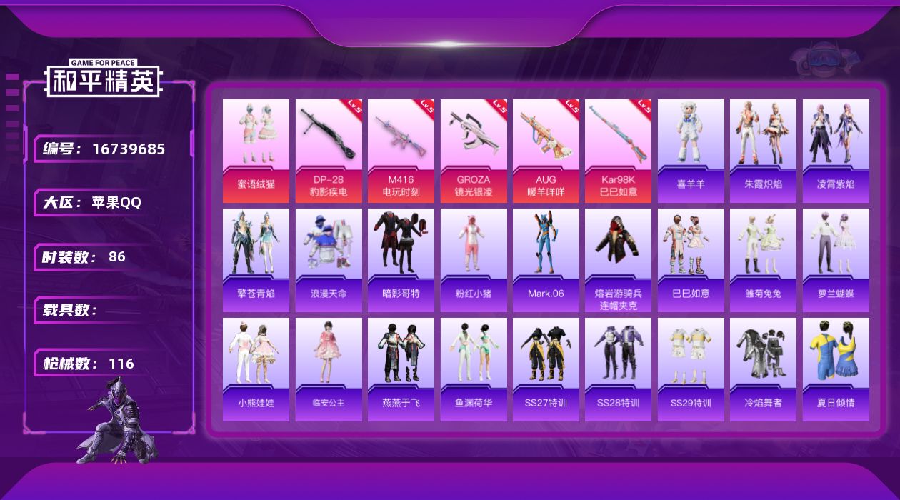 [16739685]【店主推荐捡漏号!可直接换绑】苹果 手Q-1粉装-5特效枪-0载具-3粉色飞行器-31715热力值-6王牌印记-86套装-116枪皮【热门品类】:套装-浪漫天命,套装-暗影哥特,套装-粉红小猪,角色-Mark.06,熔岩游骑兵连帽夹克【粉色套装】:粉装-蜜语绒猫【粉色枪皮等级】:M416-电玩时刻(五级),GROZA-镜光银凌(五级),AUG-暖羊咩咩(五级),Kar98K-巳巳如意(五级),DP-28-豹影疾电(五级)【粉色枪皮】:M416-电玩时刻,GROZA-镜光银凌,AUG-暖羊咩咩,Kar98K-巳巳如意,DP-28-豹影疾电【粉色飞行器】:脆鲨七海飞行器,极意拳锋飞行器