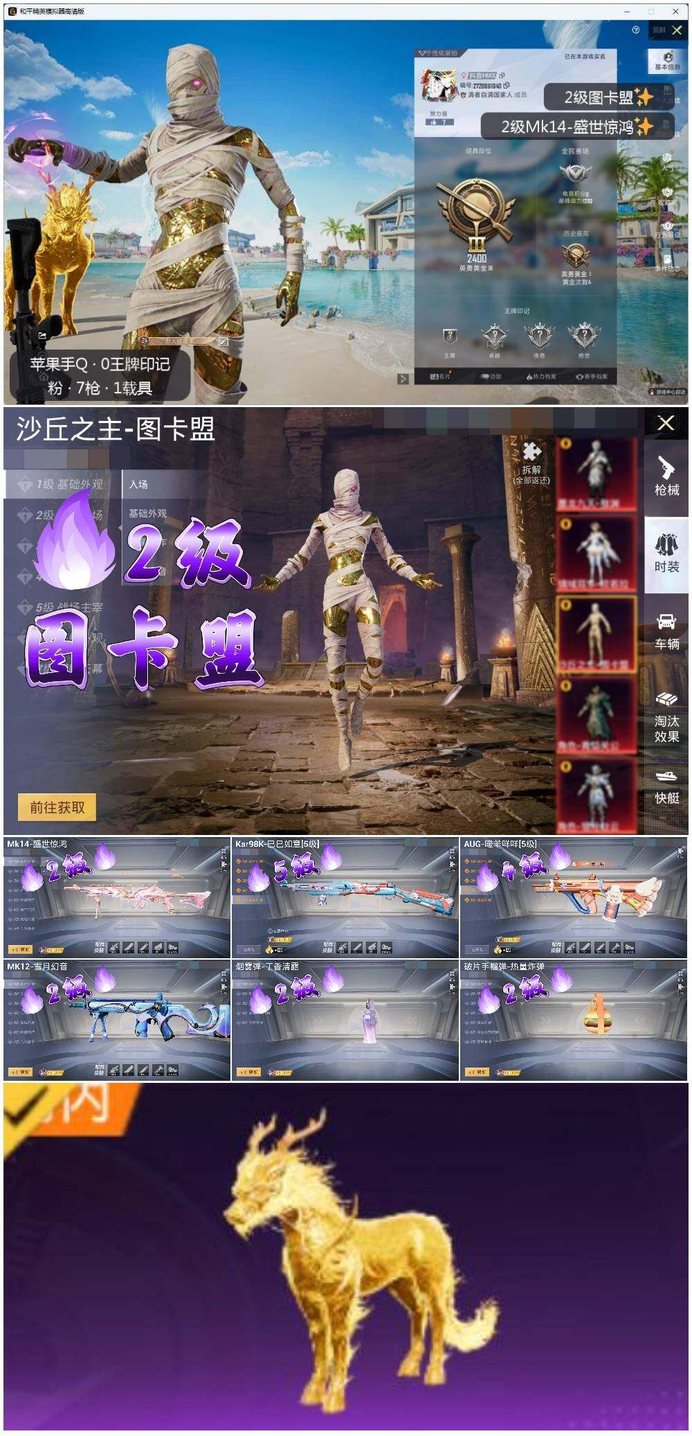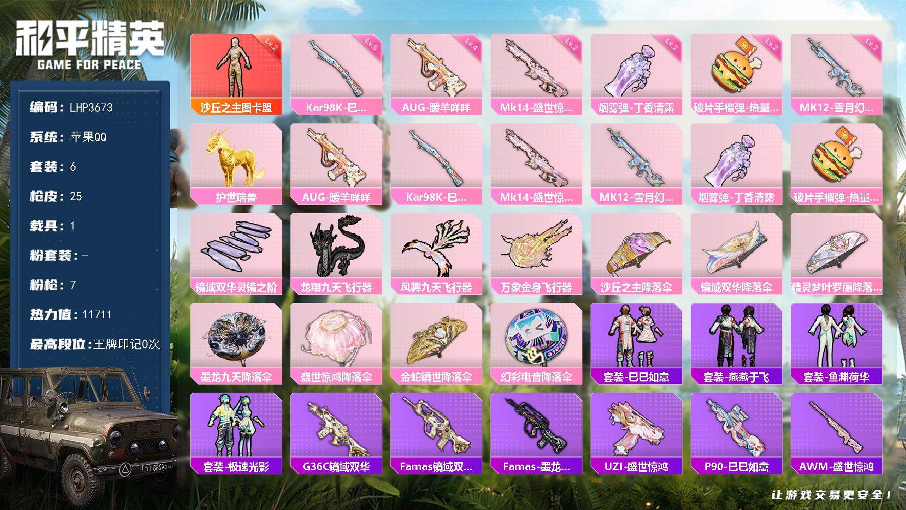 [16740411]【暑期末清货/特价急出/永久包赔】:苹果 手Q--1红装-7特效枪-1载具-1.1w热力值-6套装-25枪皮【角色神装等级】:沙丘之主-图卡盟(二级)【稀有载具】:护世瑞兽【特效枪等级】:AUG-暖羊咩咩(四级),汤姆逊-星月云朵(二级MK12-雪月幻音),Kar98K-巳巳如意(五级),Mk14-盛世惊鸿(二级),烟雾弹-丁香清露(二级),破片手榴弹-热量炸弹(二级)【优质飞行器】:镜域双华-灵镜之阶,龙翔九天飞行器,凤舞九天飞行器,万象金身飞行器