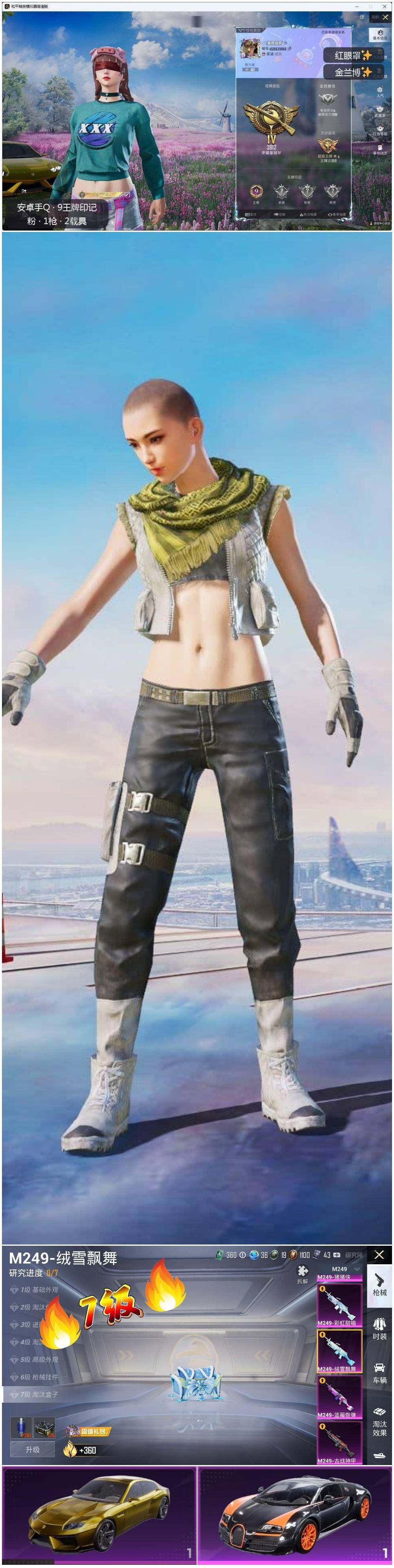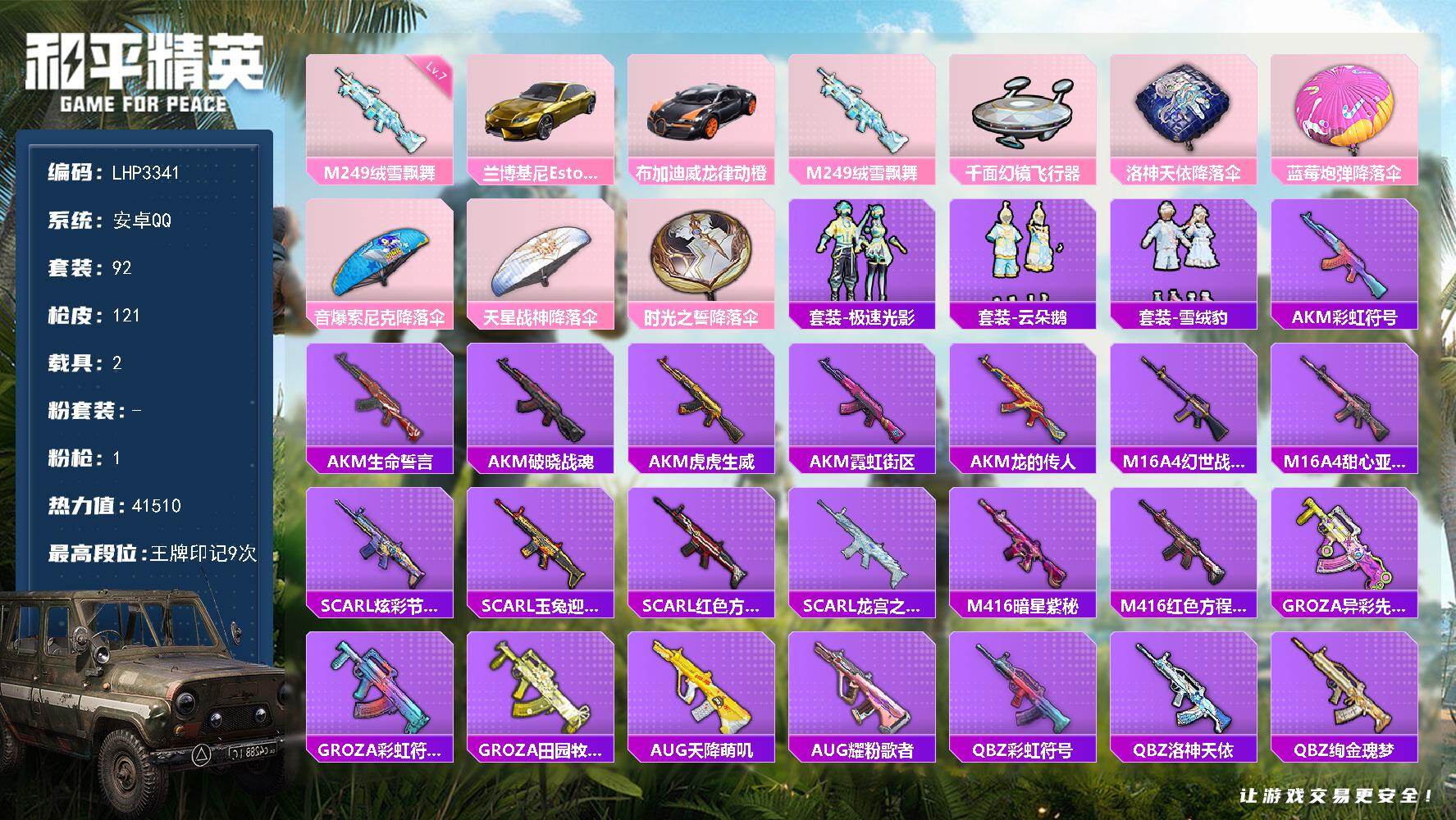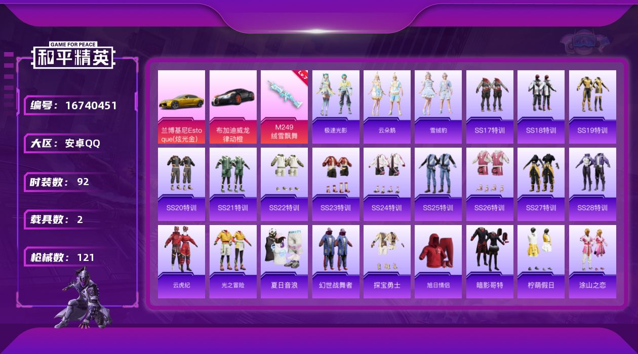 [16740451]安卓 手Q-1特效枪-2载具-4.1w热力值-9印记-92套装-121枪皮【稀有载具】:兰博基尼Estoque(炫光金),布加迪威龙(律动橙)【特效枪等级】:M249-绒雪飘舞(七级)【优质飞行器】:千面幻镜飞行器
