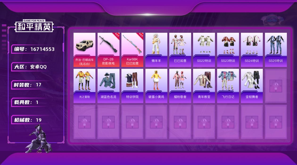 [16714553]安卓 手Q-0粉装-2特效枪-1载具-0粉色飞行器-6678热力值-2王牌印记-17套装-19枪皮【粉色枪皮等级】:Kar98K-巳巳如意(一级),DP-28-豹影疾电(一级)【粉色载具】:乔治巴顿战车(乳石白)【粉色枪皮】:Kar98K-巳巳如意,DP-28-豹影疾电【粉色降落伞】:圣堂之誓降落伞,冷漠罗丽降落伞【稀有套装】:套装-巳巳如意,玩偶服-懒羊羊【稀有枪皮】:AKM-破晓战魂,SCAR-L-冷漠罗丽,M416-蓝色火焰,AUG-耀粉歌者,蜜獾-天降萌叽,Kar98K-梦幻火箭,AWM-圣堂之誓,Mini14-耀粉歌者,S12K-玩趣呆呆【其他套装】:套装-SS22特训,套装-SS23特训,套装-SS24特训,套装-SS25特训,套装-光之冒险,套装-湖蓝色名流,套装-特训学院,套装-破蛋小黄鸡,套装-耀粉歌者,套装-青年