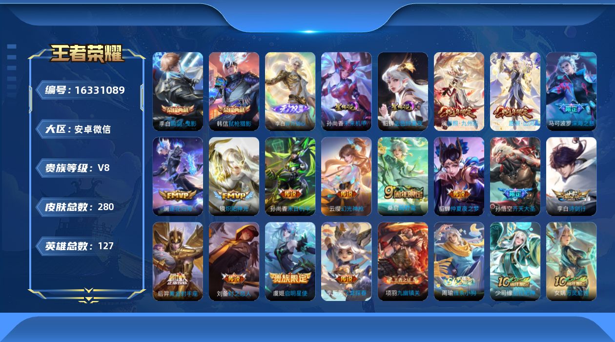 [16331089]安卓WX-V8-最强王者段位-127英雄-280皮肤-2典藏皮肤-1无双-16传说-79史诗