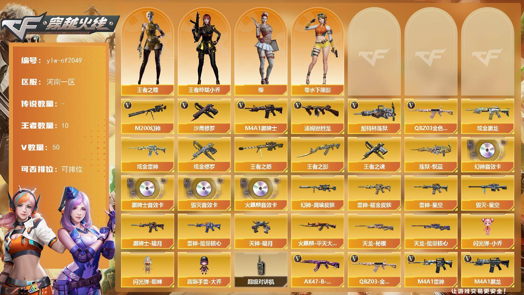 [16748803]河南一区-50V-10王者-4炫金 【热门武器】:QBZ03-金色蔷薇,M200-幻神,M4A1-黑骑士,汤姆逊-烈龙*2,加特林-炼狱,沙鹰-修罗*3 【王者炫金武器】:炫金黑龙,炫金雷神*2,炫金修罗,炼狱-悦蓝*2,王者之影,王者之怒,王者之魂 【音效卡】:M200-幻神音效卡,AK47-火麒麟音效卡,M4A1-黑骑士音效卡,Barrett-毁灭音效卡 【稀有皮肤】:幻神-周瑜皮肤,雷神-能量核心,雷神-星空,雷神-耀金皮肤,火麒麟-平天大圣,黑骑士-暗月*2,毁灭-星空,天龙-秘银,天龙-能量核心,天神-暗月*2 【角色】:王者之瞳,王者玲珑-小乔,零-水下丽影,樱 【人偶武器】:闪光弹-小乔,闪光弹-貂蝉,高爆手雷-大乔 【暴走生化】:超级对讲机 【英雄级武器】:M4A1-武圣,Glock18-武圣,QBZ03-金色蔷薇,M4A1-雷神*3,M4A1-黑龙,M4A1-玫瑰精灵,M4A1-黑骑士,M4A1-死神,加特林-炼狱,汤姆逊-烈龙*2,AK47-无影,AK47-火麒麟,AWM-天龙,Barrett-毁灭*2,Barrett-极光,M200-幻神,AK47-黑鲨,M4A1-千变,黑武士-锦绣游龙,AK-47-猩红传说*3,AK47-B-战神,AK47-B-常胜将军,M4A1-赤狱骑士,沙鹰-天神,沙鹰-修罗*3,麒麟刺,擎天,龙啸,屠龙*3 【特殊枪械】:1黑骑士,2烈龙,1炼狱