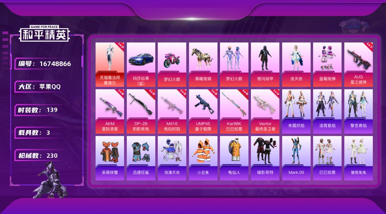 [16748866]素材身法号/地铁满天赋 苹果 手Q-1神装-4粉装-7特效枪-3载具-4粉色飞行器-7.4w热力值-13王牌印记-139套装-230枪皮【红色神装等级】:灵猫魔法师-塞维尔(二级)【热门品类】:粉装-梦幻火箭,套装-浪漫天命,套装-小丑鱼,套装-龟仙人,套装-暗影哥特,角色-Mark.06【粉色载具】:玛莎拉蒂Ghibli(蓝),双人摩托-梦幻火箭,黑曜夜骑【粉色套装】:粉装-银河战甲,粉装-梦幻火箭,角色-洛天依,粉装-蓝莓炮弹【粉色枪皮等级】:AKM-星际浪客(六级),M416-电玩时刻(五级),AUG-星之彼岸(七级),UMP45-量子极限(五级),Vector-最终圣卫者(三级),Kar98K-巳巳如意(五级),DP-28-豹影疾电(五级)【粉色飞行器】:梦幻火箭飞行器,星际浪客飞行器,灵猫魔法师飞行器,灵珠游龙飞行器