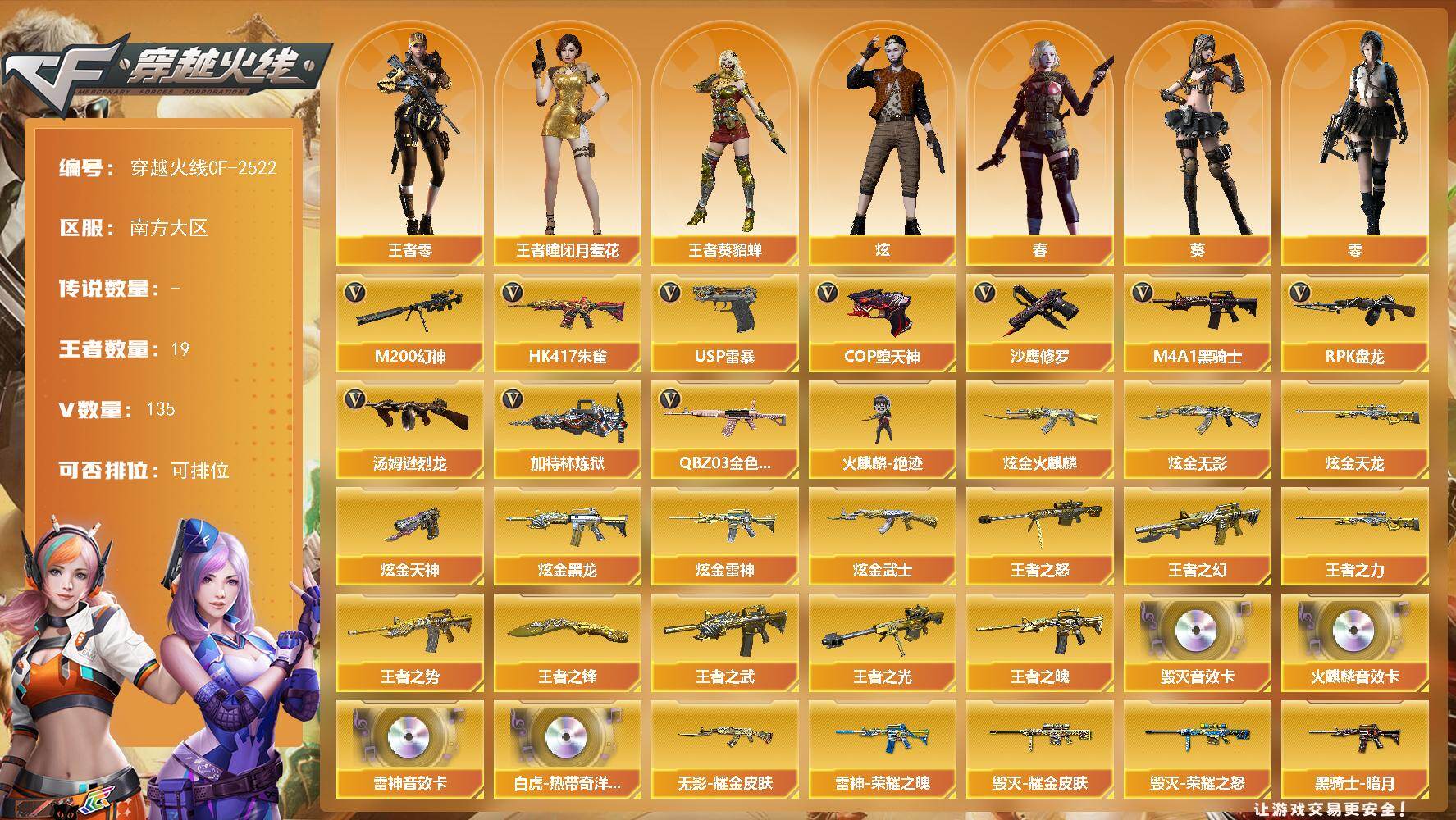 [16749658]南方大区-135V-19王者-7炫金 【热门武器】:QBZ03-金色蔷薇,HK417-朱雀,M200-幻神,M4A1-黑骑士,汤姆逊-烈龙*4,RPK-盘龙,加特林-炼狱*4,火麒麟-绝迹,USP-雷暴,COP-堕天神,沙鹰-修罗*5 【王者炫金武器】:炫金火麒麟,炫金无影,炫金天龙,炫金天神,炫金黑龙,炫金雷神,炫金武士,王者之幻,王者之势,王者之武,王者之光,王者之怒,王者之力,王者之魄,王者之锋 【音效卡】:Scar Light-白虎-热带奇洋音效卡,AK47-火麒麟音效卡,M4A1-雷神音效卡,Barrett-毁灭音效卡 【稀有皮肤】:雷神-能量核心,雷神-荣耀之魄,火麒麟-冠军之心,黑骑士-暗月*3,毁灭-暗月,毁灭-荣耀之怒,毁灭耀金皮肤,毁灭-冠军之怒,天龙-秘银,天龙-能量核心,无影耀金皮肤,天神-暗月*2 【角色】:王者-瞳-闭月羞花,王者-葵-貂蝉,王者-零,雅典娜,零-水下丽影,零,葵,炫,春,战地猎狐,蜀雪,铁骑荣耀,青霞仙子 【人偶武器】:火麒麟-绝迹,COP-旗袍,夺魂,迷你牛牛,生化手雷-机甲核心,闪光弹-貂蝉,高爆手雷-大乔 【挑战大师】:神圣爆裂者III,神圣爆裂者-末日III,阐释者III,冰龙粉碎者-白马银枪 【英雄级武器】:马来剑-夜魔,COP-堕天神,AK47-雷暴,USP-雷暴,斩神刀-雷暴,M4A1-雷霆,M4A1-武圣,QBZ03-金色蔷薇,HK417-朱雀,M4A1-雷神*3,M4A1-黑龙,M4A1-黑骑士,M4A1-死神,RPK-盘龙,加特林-炼狱*4,汤姆逊-烈龙*4,AK47-无影*3,AK47-火麒麟*3,AK47-黑武士,AK12-天启*2,AN94-超新星*3,AWM-天龙*3,Barrett-毁灭*5,Barrett-极光*2,M4A1-龙血*3,AK47-机械迷城*2,AA-12-雷霆,M200-幻神,AK47-黑鲨,M4A1-千变,黑武士-锦绣游龙,超新星-热带奇洋,AK47-B-常胜将军,沙鹰-天神*5,沙鹰-修罗*5,麒麟刺*3,擎天*3,龙啸*3,屠龙*6,龙啸-热带奇洋 【特殊枪械】:1黑骑士,4烈龙,1盘龙,4炼狱