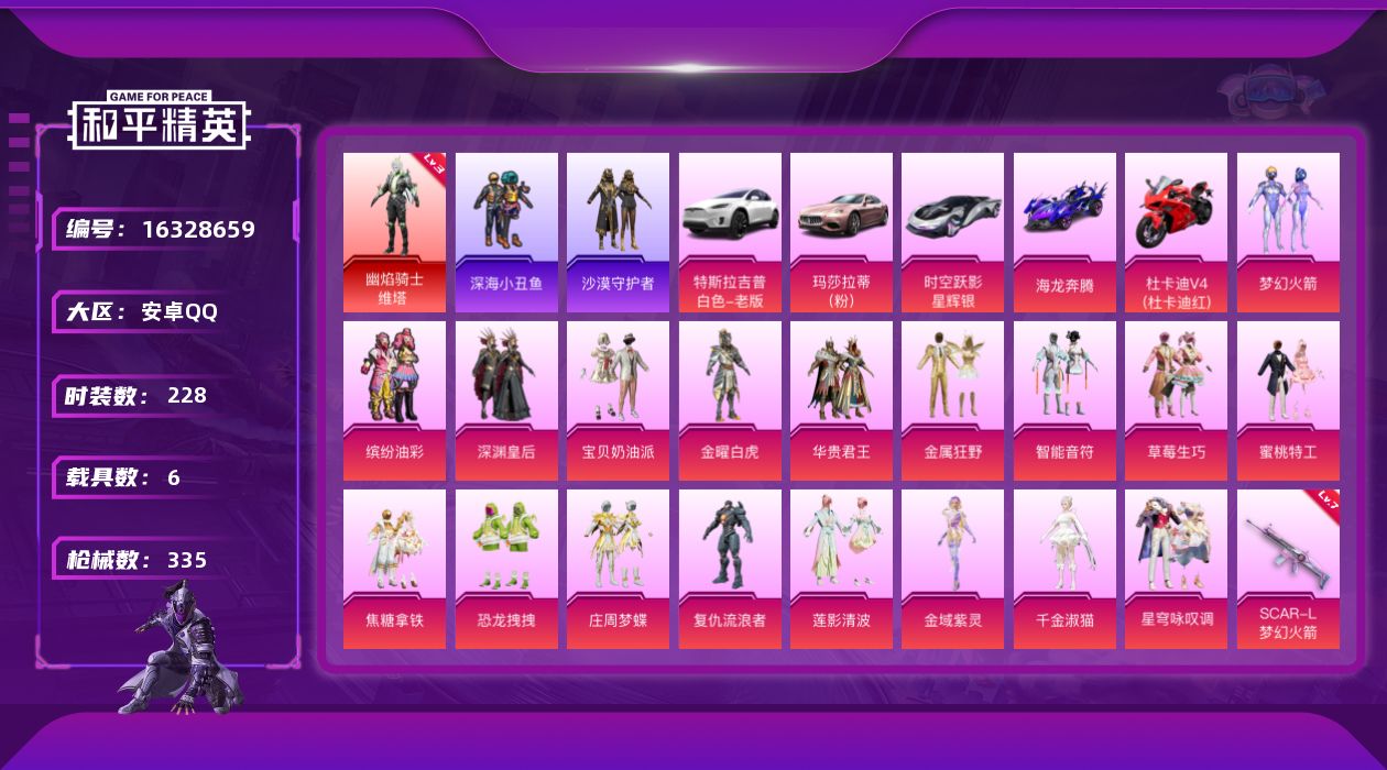 [16328659]【特价出售/店主推荐】 安卓 手Q-1神装-18粉装-17特效枪-6载具-10粉色飞行器-133196热力值-20王牌印记-228套装-335枪皮【红色神装等级】:幽焰骑士-维塔(三级)【红色角色神装】:幽焰骑士-维塔【热门品类】:粉装-梦幻火箭,粉装-缤纷油彩,套装-深海小丑鱼,角色-军刀雅典娜,套装-沙漠守护者,套装-AG追光队服,套装-龟仙人,套装-潮萌小黄鸭,套装-暗影哥特,套装-浪漫波比,角色-六号稻草人【粉色套装】:粉装-深渊皇后,粉装-宝贝奶油派,粉装-金曜白虎,粉装-梦幻火箭,粉装-华贵君王,粉装-金属狂野,粉装-智能音符,粉装-缤纷油彩,粉装-草莓生巧,粉装-蜜桃特工,粉装-焦糖拿铁,粉装-恐龙拽拽,粉装-庄周梦蝶,角色-复仇流浪者,粉装-莲影清波,角色-金域紫灵,角色-千金淑猫,粉装-星穹咏叹调【粉色枪皮等级】:AKM-炫紫旋律(四级),AKM-幽焰骑士(三级),SCAR-L-梦幻火箭(七级),M416-五爪金龙(七级),GROZA-焦糖拿铁(四级),AUG-超新星(七级),M762-甜蜜誓约(七级),UZI-绮梦青鸾(四级),UMP45-恐龙拽拽(四级),Vector-环太平洋(四级),AKS-74U-星穹咏叹调(四级),Kar98K-巳巳如意(四级),M24-镜域双华(三级),DP-28-豹影疾电(五级),MG3-炙焰牛王(七级),烟雾弹-甜梦果泡(五级),破片手榴弹-瓶中星球(五级)【粉色载具】:特斯拉Model X(珍珠白),玛莎拉蒂Ghibli(粉),时空跃影(星辉银),海龙奔腾,杜卡迪 Panigale V4(杜卡迪红),僚机-永恒黄蜂【粉色枪皮】:AKM-炫紫旋律,AKM-幽焰骑士,SCAR-L-梦幻火箭,M416-五爪金龙,GROZA-焦糖拿铁,AUG-超新星,M762-甜蜜誓约,UZI-绮梦青鸾,UMP45-恐龙拽拽,Vector-环太平洋,AKS-74U-星穹咏叹调,Kar98K-巳巳如意,M24-镜域双华,DP-28-豹影疾电,MG3-炙焰牛王,烟雾弹-甜梦果泡,破片手榴弹-瓶中星球【粉色飞行器】:春暖花开飞行器,梦幻火箭飞行器,炫紫旋律飞行器,天之羽翼飞行器,镜域双华-灵镜之阶,幽焰列车飞行器,脆鲨七海飞行器,极意拳锋飞行器