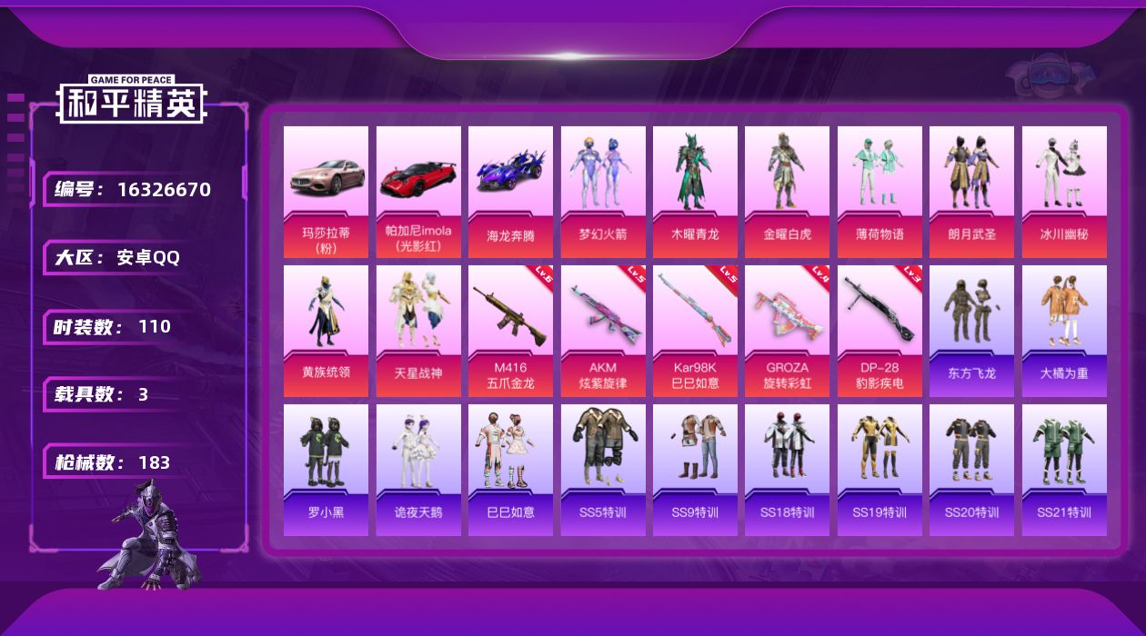 [16326670]【特价出售/店主推荐】安卓 手Q-8粉装-5特效枪-3载具-3粉色飞行器-58601热力值-1王牌印记-110套装-183枪皮【热门品类】:粉装-梦幻火箭【粉色套装】:粉装-木曜青龙,粉装-金曜白虎,粉装-梦幻火箭,粉装-薄荷物语,粉装-朗月武圣,粉装-冰川幽秘,粉装-黄族统领,粉装-天星战神【粉色枪皮等级】:AKM-炫紫旋律(五级),M416-五爪金龙(六级),GROZA-旋转彩虹(四级),Kar98K-巳巳如意(五级),DP-28-豹影疾电(三级)【粉色载具】:玛莎拉蒂Ghibli(粉),帕加尼imola(光影红),海龙奔腾【粉色枪皮】:AKM-炫紫旋律,M416-五爪金龙,GROZA-旋转彩虹,Kar98K-巳巳如意,DP-28-豹影疾电【粉色飞行器】:伏魔团飞行器,千面幻镜飞行器,黄族统领飞行器