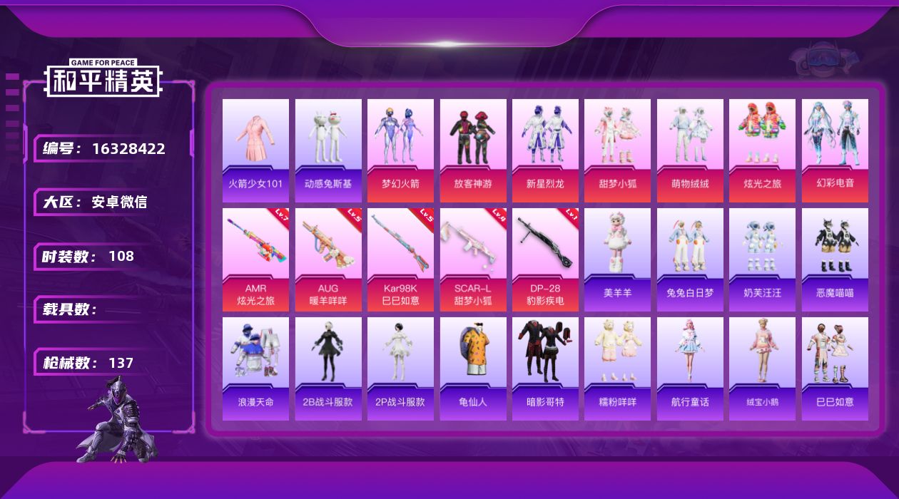 [16328422]极品老v1小号!【特价出售/店主推荐】安卓 微信-7粉装-5特效枪-0载具-3粉色飞行器-42536热力值-13王牌印记-108套装-137枪皮【热门品类】:粉装-梦幻火箭,套装-浪漫天命,套装-火箭少女101,套装-动感兔斯基人偶服,角色-2B战斗服款,角色-2P战斗服款,套装-龟仙人,套装-暗影哥特,套装-糯粉咩咩【粉色套装】:粉装-梦幻火箭,粉装-放客神游,粉装-新星烈龙,粉装-甜梦小狐,粉装-萌物绒绒,粉装-炫光之旅,粉装-幻彩电音【粉色枪皮等级】:SCAR-L-甜梦小狐(四级),AUG-暖羊咩咩(五级),Kar98K-巳巳如意(五级),AMR-炫光之旅(七级),DP-28-豹影疾电(一级)【粉色枪皮】:SCAR-L-甜梦小狐,AUG-暖羊咩咩,Kar98K-巳巳如意,AMR-炫光之旅,DP-28-豹影疾电【粉色飞行器】:甜梦小狐飞行器,萌物绒绒飞行器