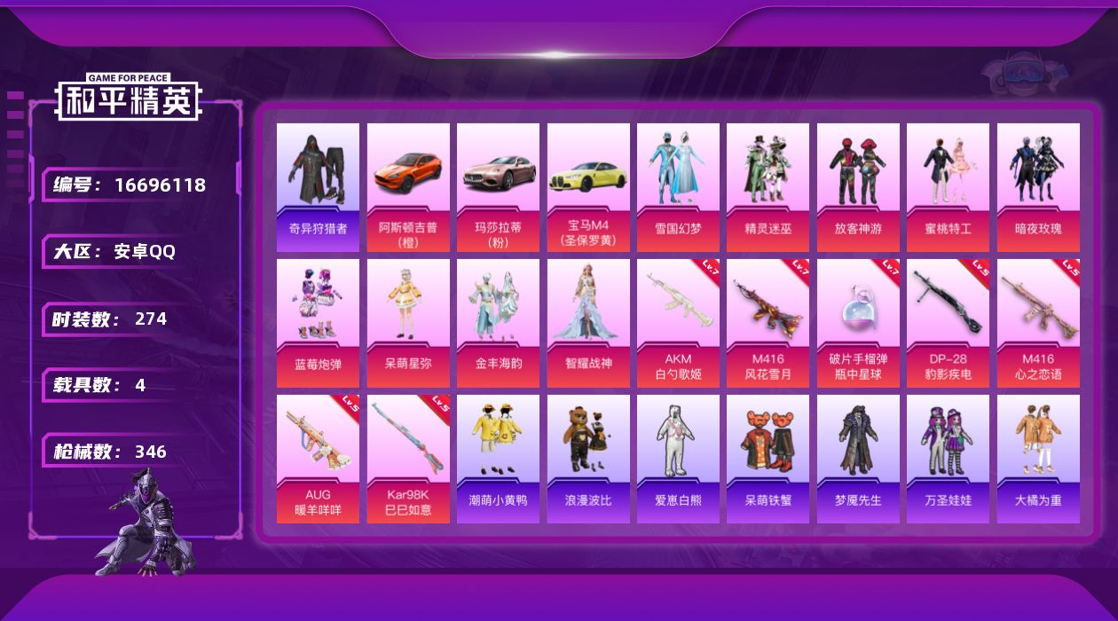 [16696118]安卓 手Q-9粉装-7特效枪-4载具-2粉色飞行器-117009热力值-20王牌印记-274套装-346枪皮【热门品类】:粉装-雪国幻梦,套装-小丑鱼,套装-奇异狩猎者,套装-龟仙人,套装-潮萌小黄鸭,套装-浪漫波比,套装-粉红小猪,角色-8号机,角色-Mark.06【粉色套装】:粉装-雪国幻梦,粉装-精灵迷巫,粉装-放客神游,粉装-蜜桃特工,粉装-暗夜玫瑰,粉装-蓝莓炮弹,角色-呆萌星弥,粉装-金丰海韵,角色-智耀战神【粉色枪皮等级】:AKM-白勺歌姬(七级),M416-心之恋语(五级),M416-风花雪月(七级),AUG-暖羊咩咩(五级),Kar98K-巳巳如意(五级),DP-28-豹影疾电(五级),破片手榴弹-瓶中星球(七级)【粉色载具】:阿斯顿马丁DBX(橙),玛莎拉蒂Ghibli(粉),宝马M4(圣保罗黄),僚机-萌兔起飞【粉色枪皮】:AKM-白勺歌姬,M416-心之恋语,M416-风花雪月,AUG-暖羊咩咩,Kar98K-巳巳如意,DP-28-豹影疾电,破片手榴弹-瓶中星球【粉色飞行器】:枪炮玫瑰飞行器