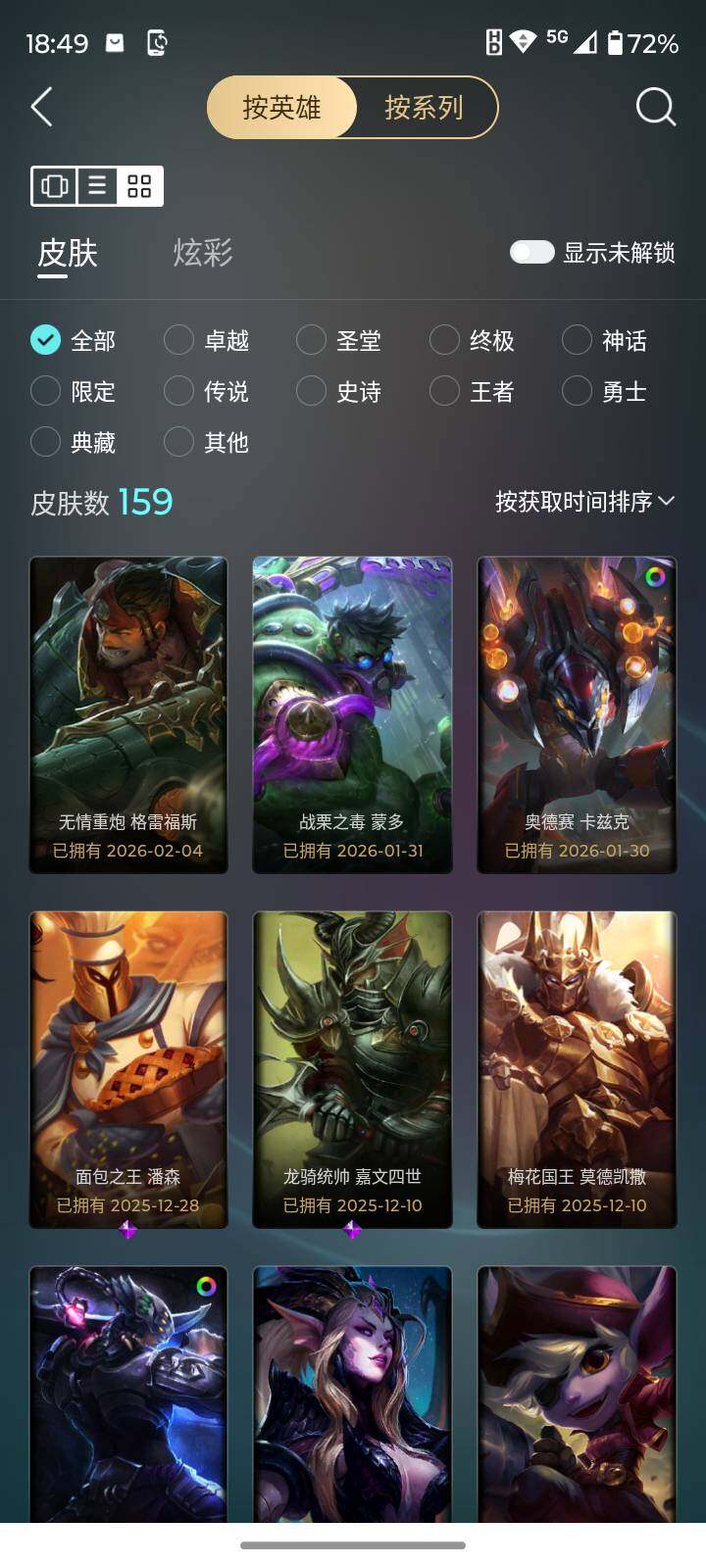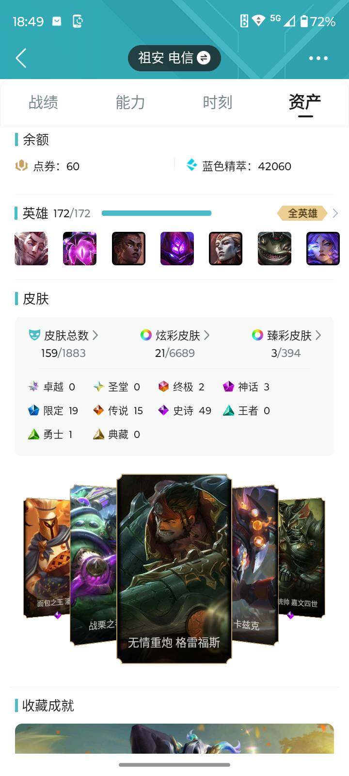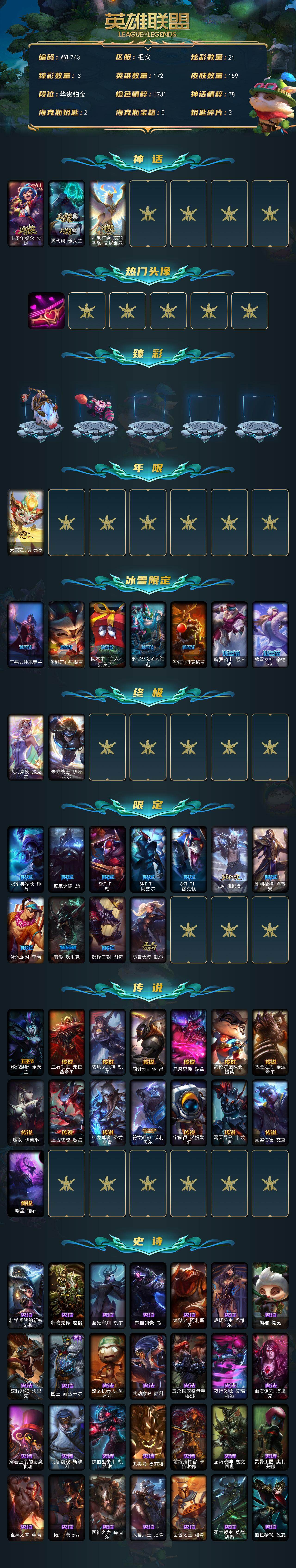 [16752379]【店主推荐捡漏号】铂金段位-172英雄-159皮肤-21炫彩-2终极-3神话-19限定-15传说-49史诗