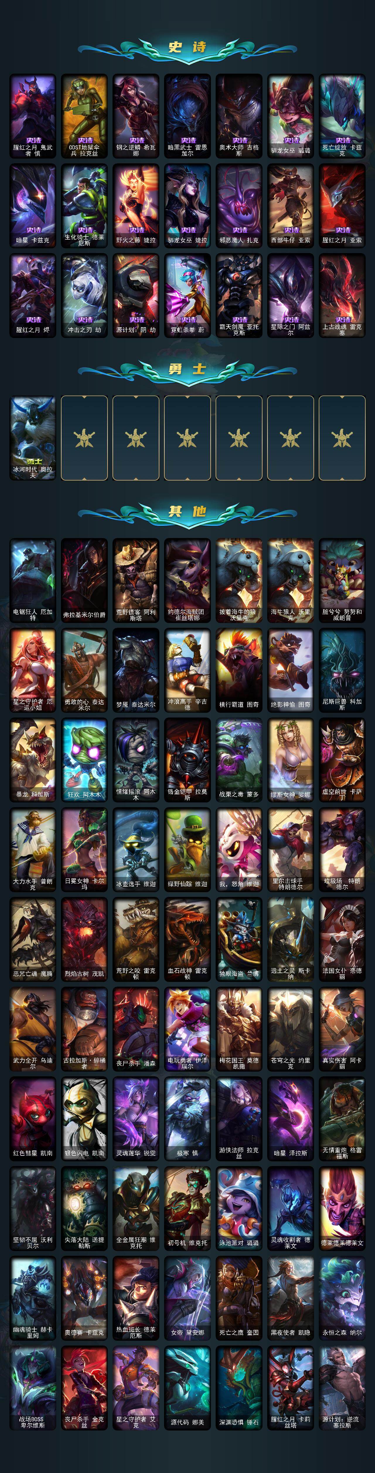 【史诗皮肤】:科学怪熊的新娘安妮,特战先锋赵信,圣光审判凯尔,铁血剑豪易,地狱火阿利斯塔,战场公主希维尔,熊猫提莫,荒野豺狼沃里克,国王泰达米尔,殇之机器人阿木木,武动巅峰萨科,五杀摇滚键盘手娑娜,夜行义贼艾瑞莉娅,血石诅咒塔里克,穿着正装的恶魔维迦,北领前线斯维因,铁血狙击手凯特琳,无畏号墨菲特,前线指挥官卡特琳娜,龙骑统帅嘉文四世,灵骨工匠奥莉安娜,至高之拳李青,艳后奈德丽,四神之力乌迪尔,大夏武士潘森,面包之王潘森,死亡领主莫德凯撒,血色精锐锐雯,腥红之月鬼武者慎,ODST地狱伞兵拉克丝,钢之逆鳞希瓦娜,暗黑武士雷恩加尔,奥术大师吉格斯,驯龙女巫璐璐,死亡绽放卡兹克,暗星卡兹克,生化骑士德莱厄斯,野火之藤婕拉,驯龙女巫婕拉,邪恶魔人扎克,西部牛仔亚索,腥红之月亚索,腥红之月烬,冲击之刃劫,源计划阴劫,霓虹杀拳蔚,霸天剑魔亚托克斯,星际之门阿兹尔,上古战魂雷克塞