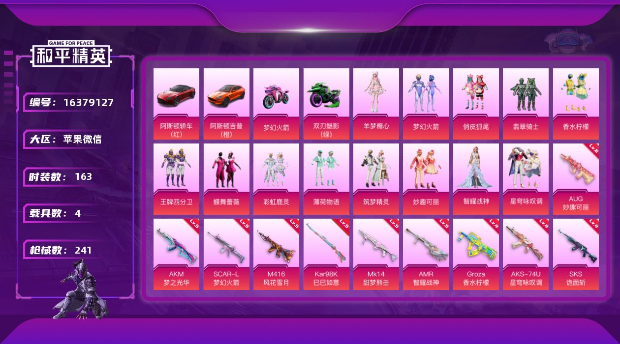 [16379127]【特价出售/店主推荐】苹果 微信-13粉装-13特效枪-4载具-3粉色飞行器-94456热力值-3王牌印记-163套装-241枪皮【热门品类】:粉装-梦幻火箭,角色-六号稻草人【粉色套装】:粉装-梦幻火箭,粉装-俏皮狐尾,粉装-翡翠骑士,粉装-香水柠檬,粉装-王牌四分卫,粉装-蝶舞蔷薇,粉装-彩虹鹿灵,粉装-薄荷物语,粉装-筑梦精灵,粉装-妙趣可丽,角色-智耀战神,粉装-星穹咏叹调,角色-羊梦糖心【粉色枪皮等级】:AKM-梦之光华(五级),SCAR-L-梦幻火箭(五级),M416-风花雪月(五级),GROZA-香水柠檬(四级),AUG-妙趣可丽(六级),AKS-74U-星穹咏叹调(四级),Kar98K-巳巳如意(五级),Kar98K-圣域龙灵(三级),SKS-诡面斩(四级),Mini14-荧光虫舞(四级),Mk14-甜梦熊击(五级),AMR-智耀战神(五级),DP-28-枪炮玫瑰(四级)【粉色载具】:阿斯顿马丁DBS(红),阿斯顿马丁DBX(橙),双人摩托-梦幻火箭,双人摩托-双刃魅影(绿),空客H135-蔚蓝之翼,僚机-圣域龙宝【粉色枪皮】:AKM-梦之光华,SCAR-L-梦幻火箭,M416-风花雪月,GROZA-香水柠檬,AUG-妙趣可丽,AKS-74U-星穹咏叹调,Kar98K-巳巳如意,Kar98K-圣域龙灵,SKS-诡面斩,Mini14-荧光虫舞,Mk14-甜梦熊击,AMR-智耀战神,DP-28-枪炮玫瑰【粉色飞行器】:梦幻火箭飞行器,阿狸红飞行器,圣域金龙飞行器
