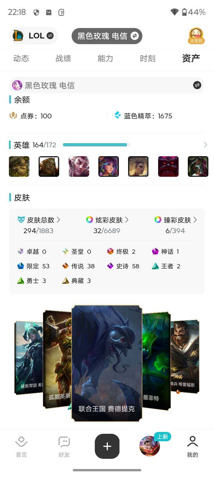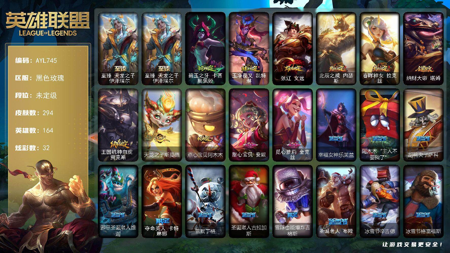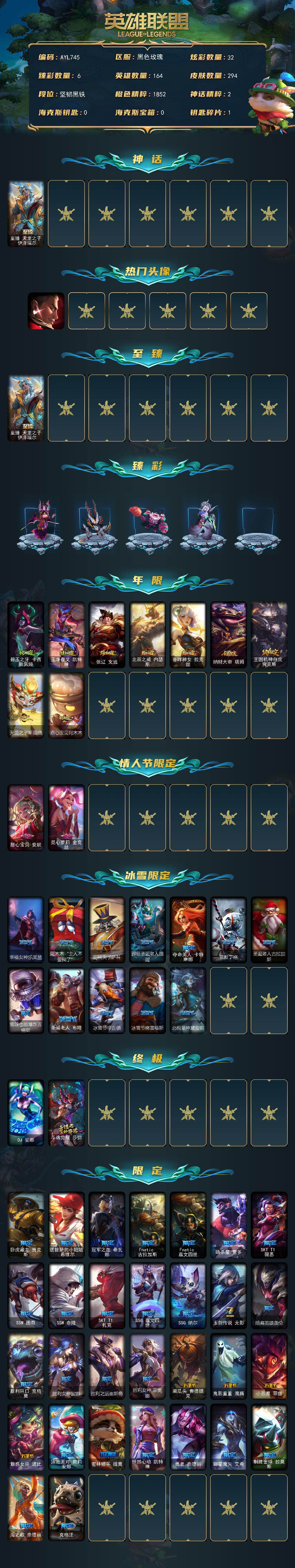 [16752452]【店主推荐捡漏号】未定级段位-164英雄-294皮肤-32炫彩-2终极-1神话-53限定-38传说-58史诗