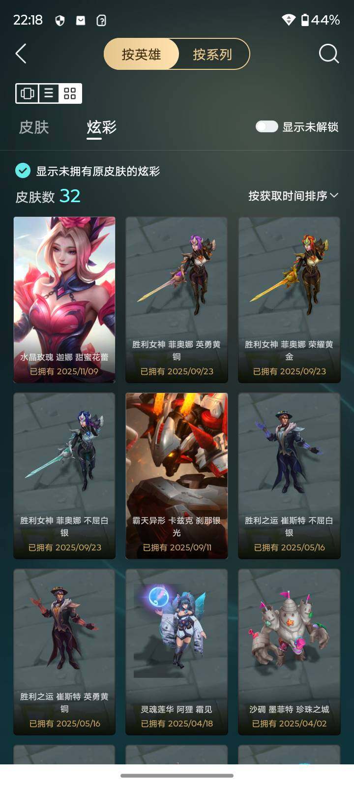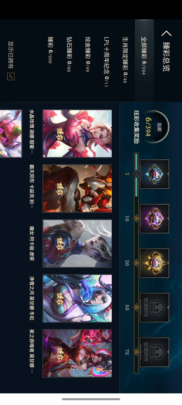 【臻彩皮肤】:星之吞噬者莫甘娜热情之末,霸天异形卡兹克刹那银光,可爱可爱粉红红布里茨,魔女阿卡丽虚荣,净雪之月莫甘娜冬虹,水晶玫瑰迦娜甜蜜花蕾